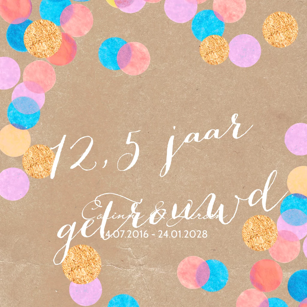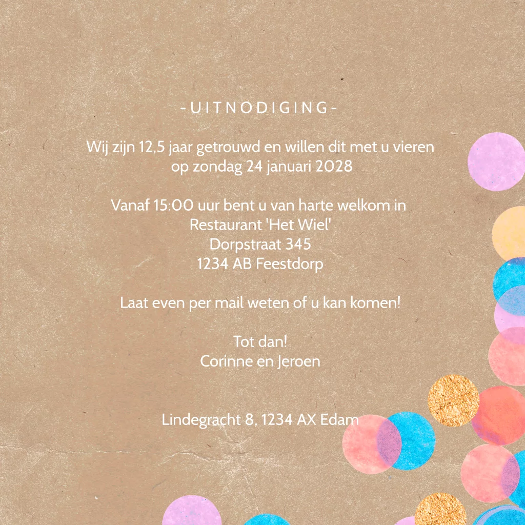 Deze feestelijke confetti kaart met pastel tinten, is een al een feestje op zich om te versturen. Nodig al jullie vrienden en familie uit voor jullie 12,5 jarig jubileum met deze leuke kaart. Gaaf met een bijpassende pastel kleur envelop!