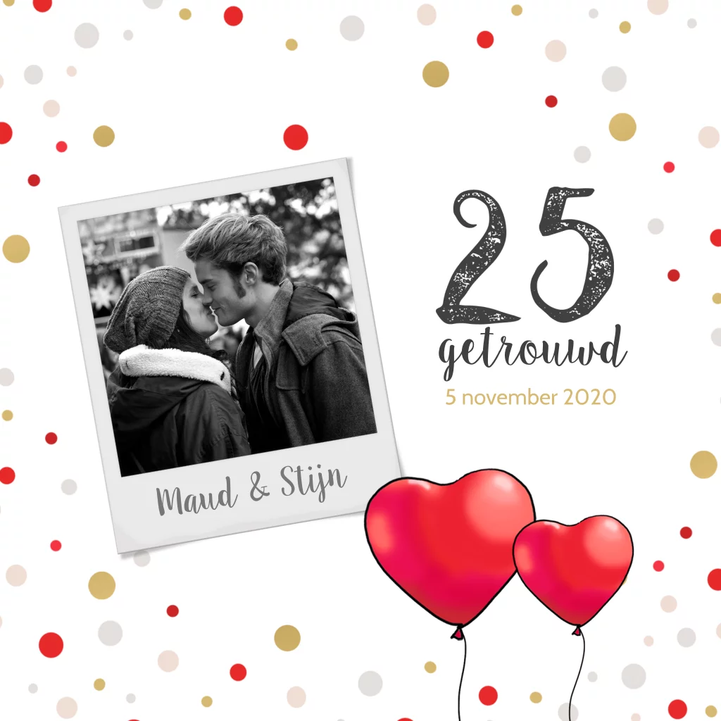 Bijzonder leuke en originele jubileumkaart met leuke vrolijke confetti en foto en ballonnen. Getekend door Anet Illustraties. Gaaf om een bijpassende rode envelop te kiezen.