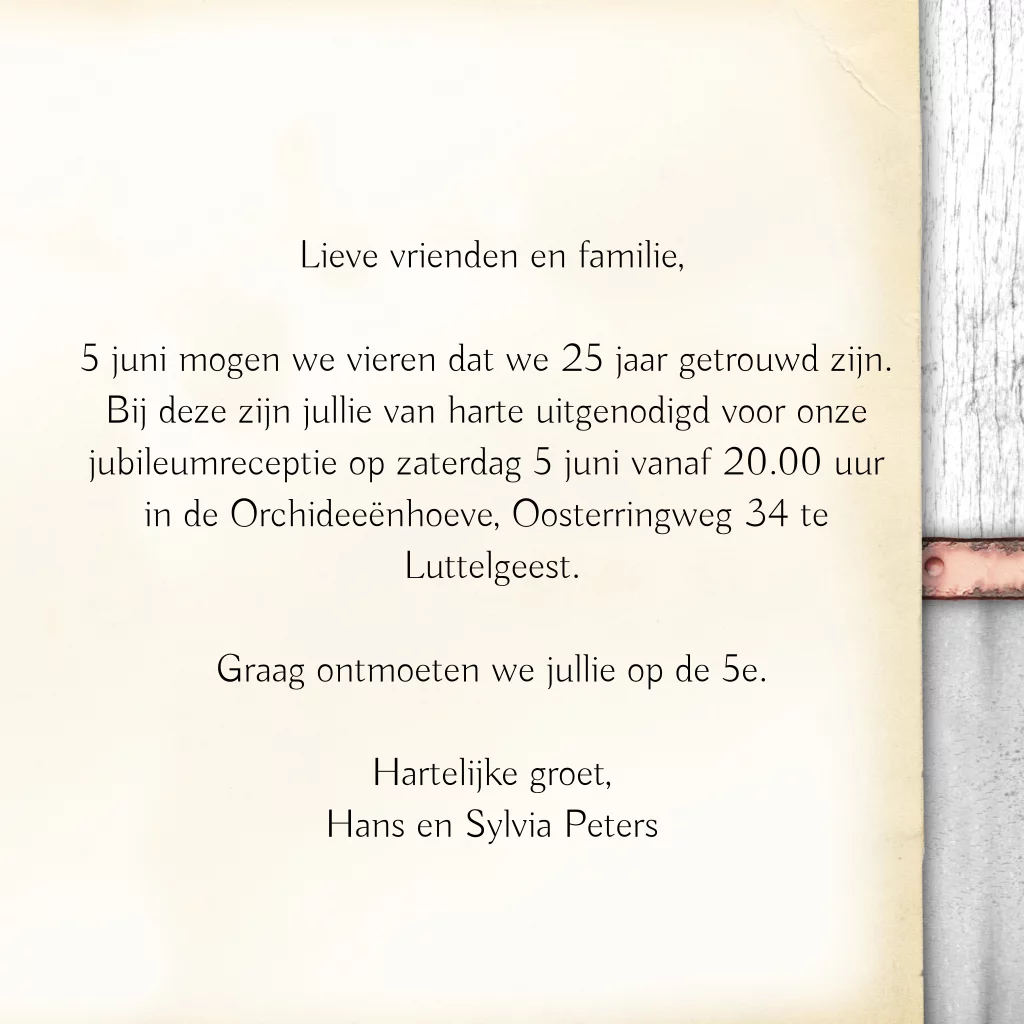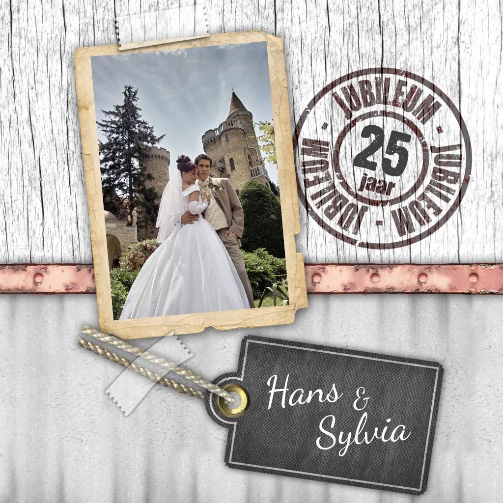 Vieren jullie een zilveren jubileum? Maak hier jullie eigen gepersonaliseerde uitnodiging. Deze uitnodiging heeft een landelijke uitstraling. Op de voorkant is er plek voor een persoonlijke foto. Op de achtergrond is er een houtprint afgebeeld. Ook staat er een stempel op de voorkant met 25 jaar jubileum. Aan de binnenkant is er genoeg ruimte voor persoonlijke tekst en wordt de stijl doorgetrokken.