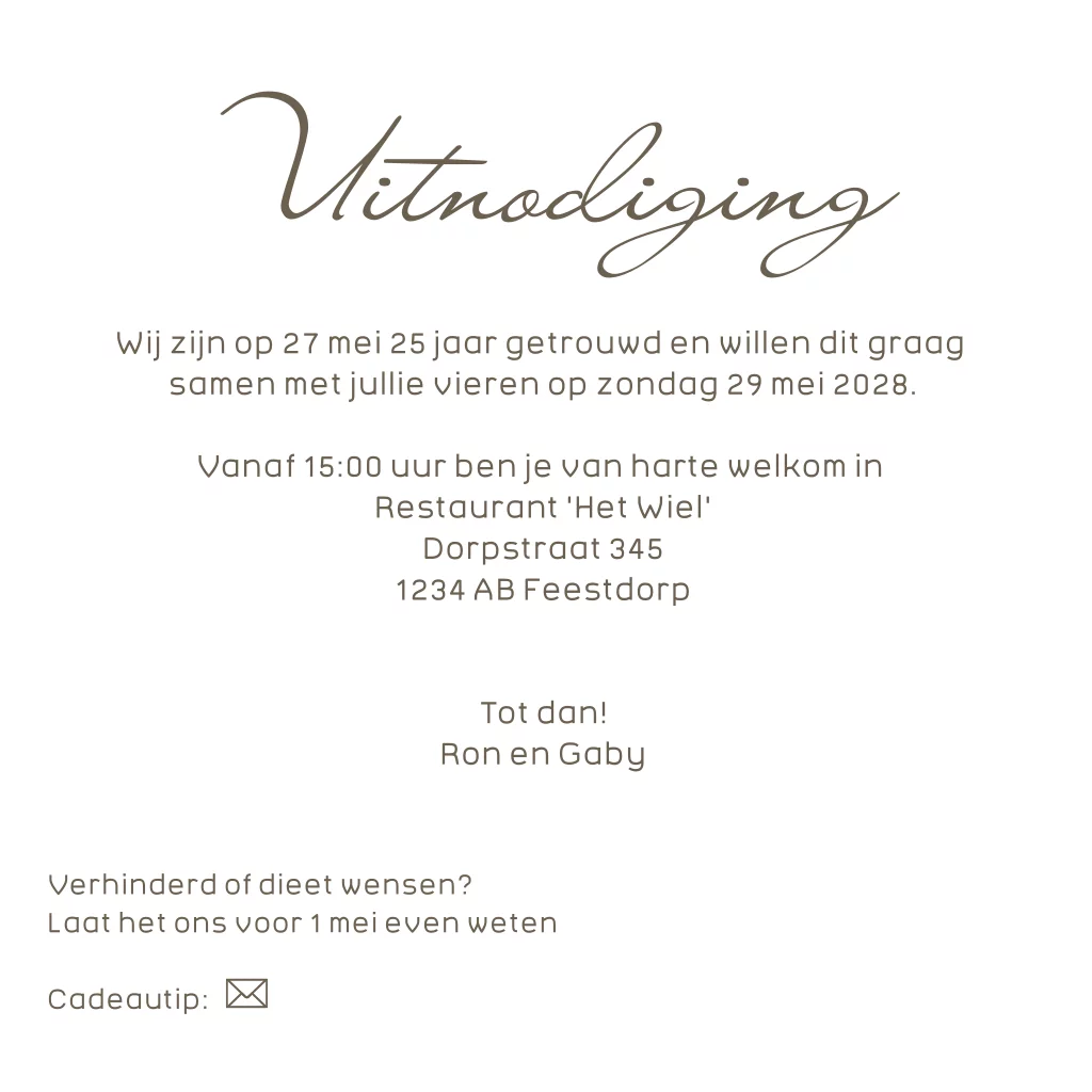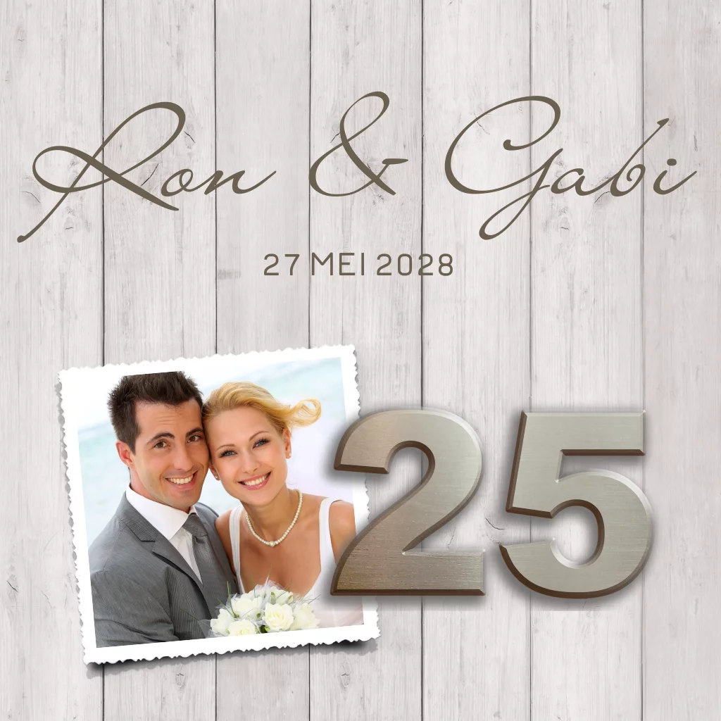 Uitnodiging voor een zestig jarig huwelijksjubileum. Deze kaart heeft een hout print met een grote zilveren 25 in het midden. Mooi afgewerkt met witte getekende hart en foto van jullie samen.