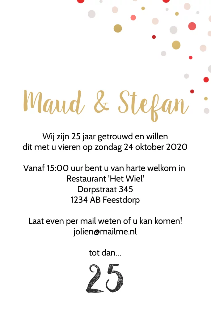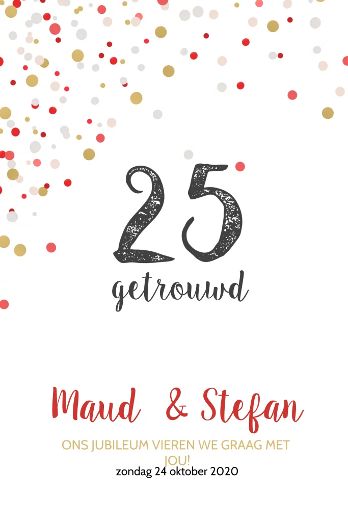 Bijzonder leuke en originele jubileumkaart voor 25 jarig huwelijk. Mooi geïllustreerd met leuke vrolijke confetti en aanpasbare tekst. Maak het af met een rode envelop.