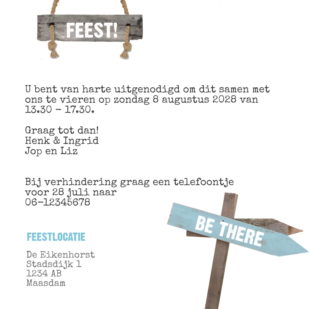 Feestelijke strandpaal uitnodiging voor jullie 25 jarig huwelijksjubileum. Leuke wegwijzer met daarop verschillende vrolijke lettertypes. Maak het af door te kiezen voor een bijpassende kleur envelop.