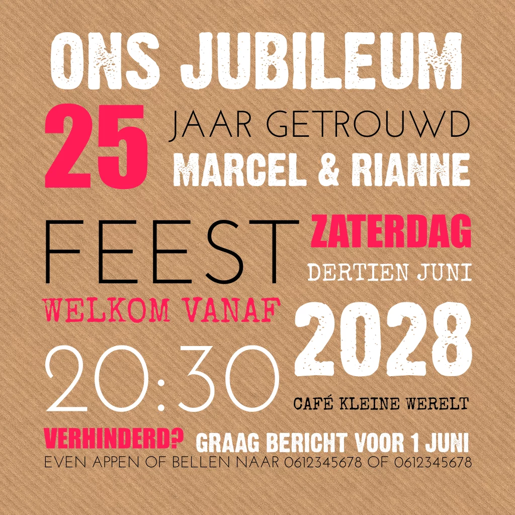 Stoere uitnodiging voor jullie 25 jarig huwelijksjubileum. Extra feestelijk door de toevoeging van de felle roze cijfers en letter. Uiteraard geheel naar wens aan te passen. Gaaf met een bijpassende kraft envelop.