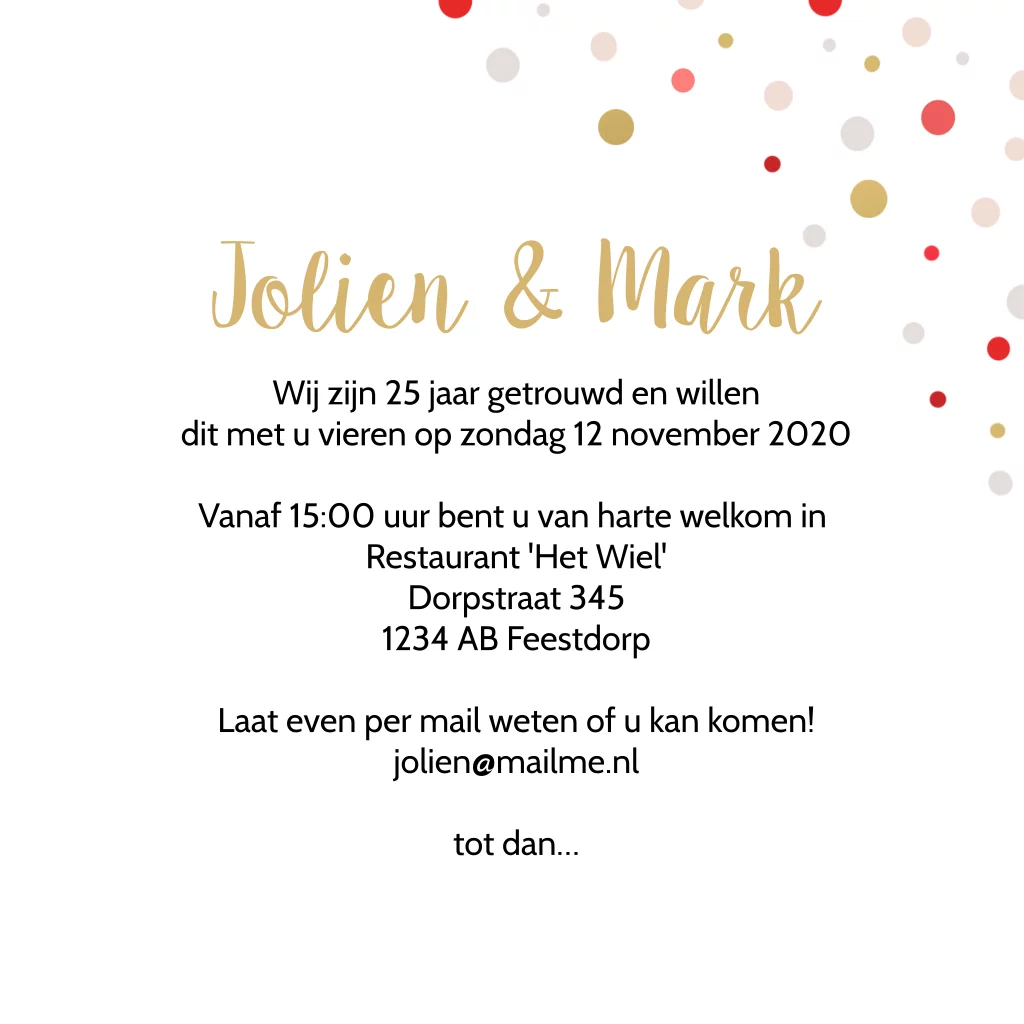 Bijzonder leuke en originele jubileumkaart met hip busje in rood en leuke vrolijke confetti. Getekend door Anet Illustraties. Gaaf met een bijpassende rode envelop.