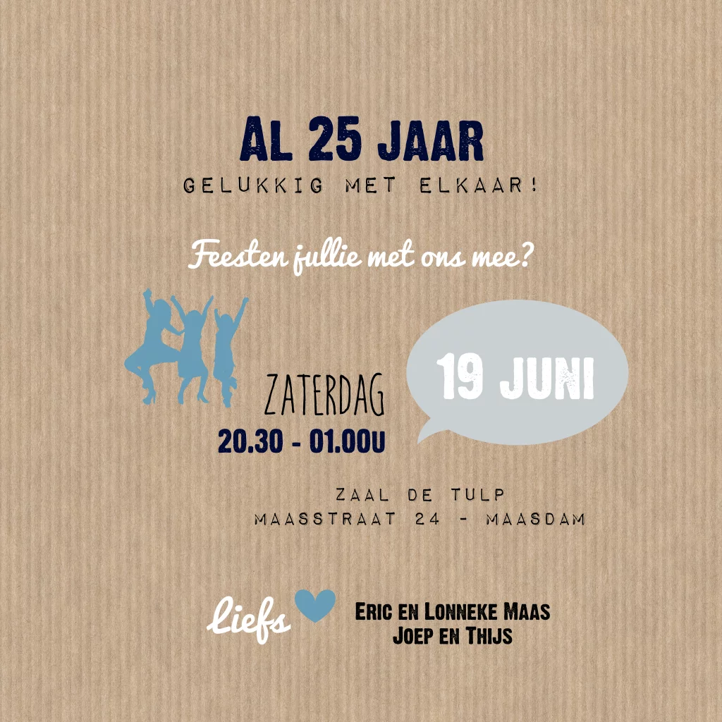 Uitnodigingskaart voor jullie 25 jarig huwelijk. Nodig al jullie vrienden en familie uit met deze feestelijke kraft uitnodiging. Proost op jullie bijzondere mijlpaal. Leuk ook met een kraft envelop!
