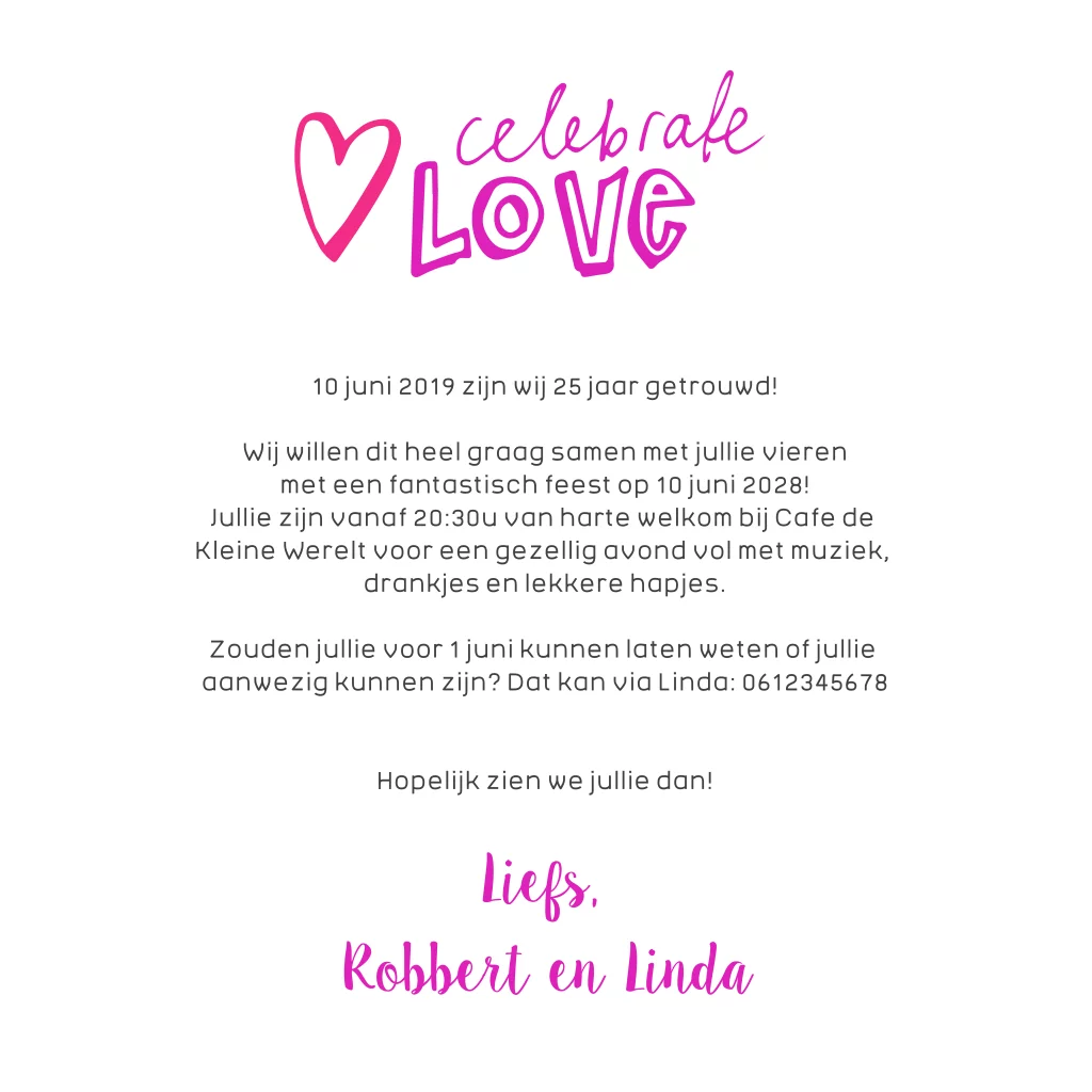 Door het felle roze is deze uitnodiging extra feestelijk. Nodig al jullie vrienden en familie uit voor deze speciale dag. Kies om het helemaal af te maken voor een bijpassende kleur envelop.