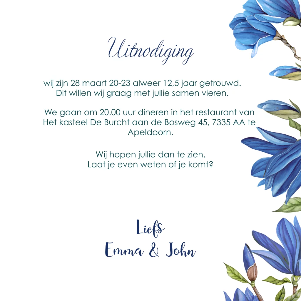 Vierkante huwelijksjubileumuitnodiging met prachtige magnoliabloemen in het blauw