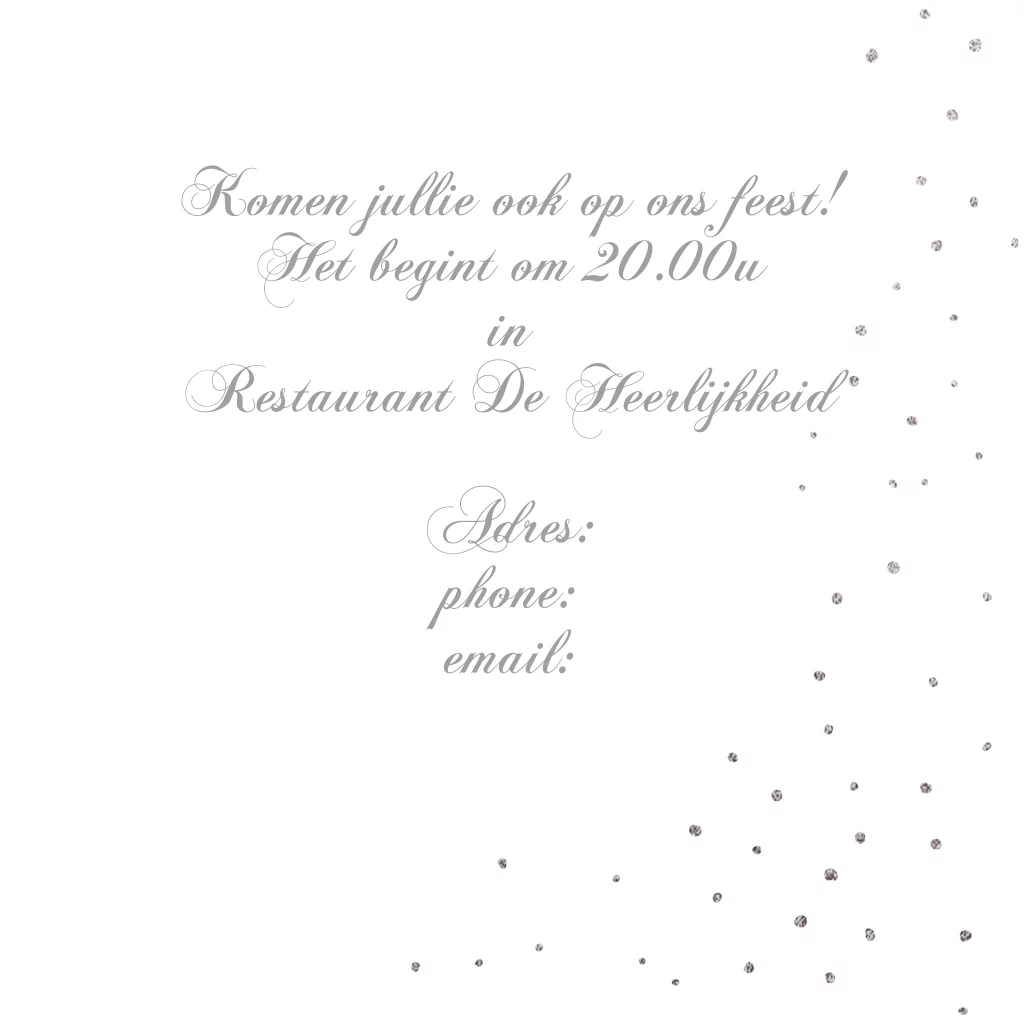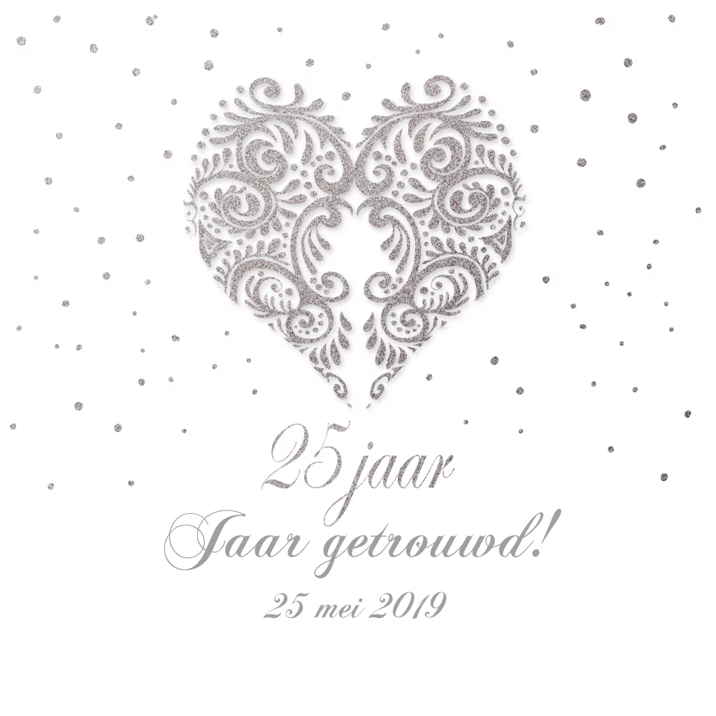 Kaartje voor een huwelijksjubileum met zilveren hart en confetti.