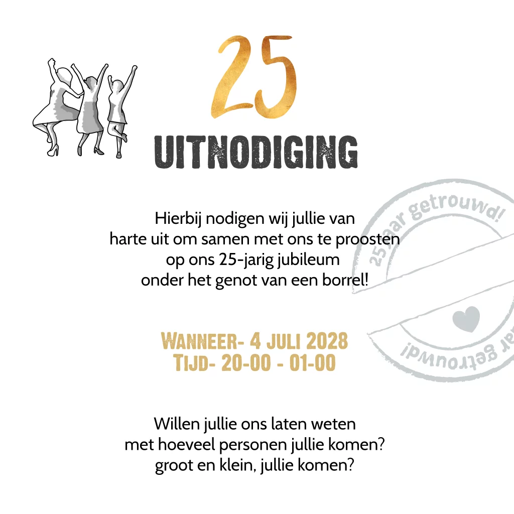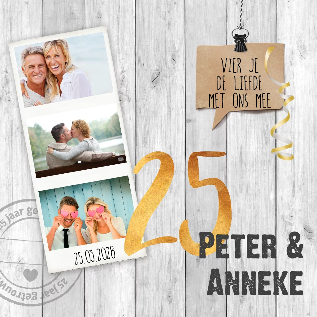 Jubileumkaart voor 25 jaar getrouwd. Feestelijke en persoonlijke kaart door de toevoeging van de gouden accenten en foto's.
