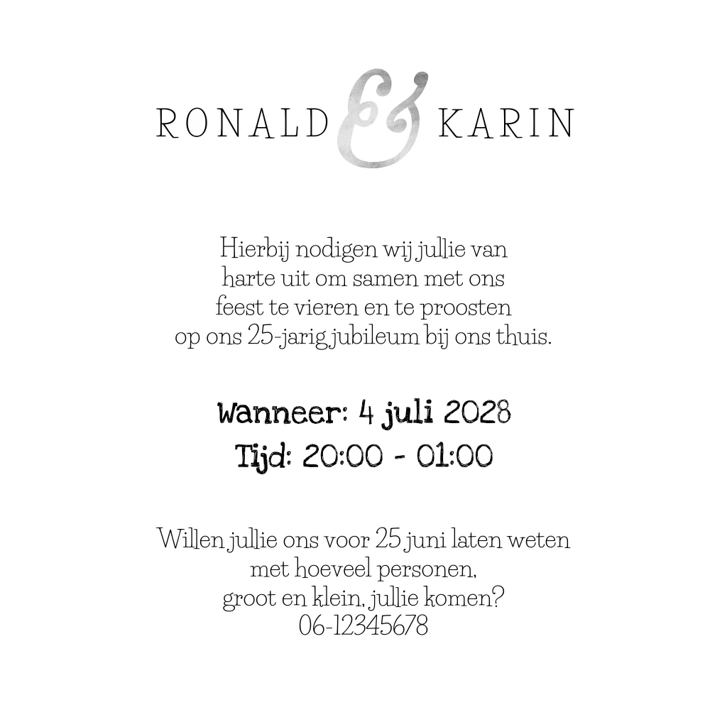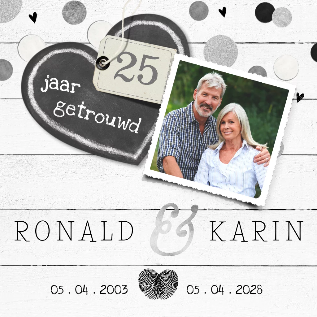Deze uitnodigingskaart past perfect bij jullie zilveren jubileum. 25 jaar getrouwd zijn moet groots gevierd worden. Feestelijk door de confetti en romantisch door de foto en het hartje van vingerafdrukken. Gaaf met een zilveren envelop.