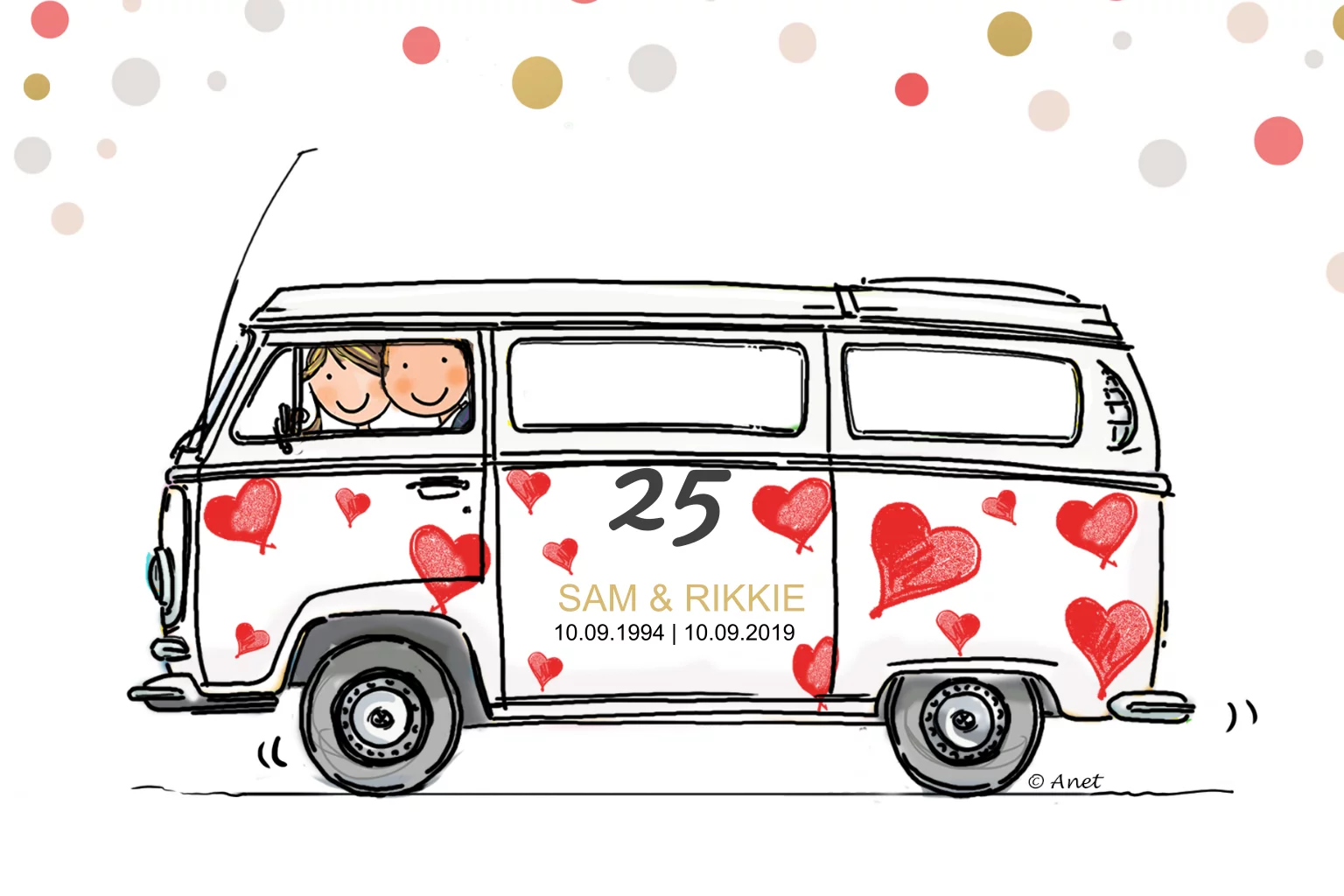 Super leuk jubileumkaartje met een hip busje met echtpaar vol met confetti en hartjes. Getekend door Anet Illustraties. Maak jullie 25 jarig jubileum uitnodiging compleet door een bijpassende rode envelop te kiezen.
