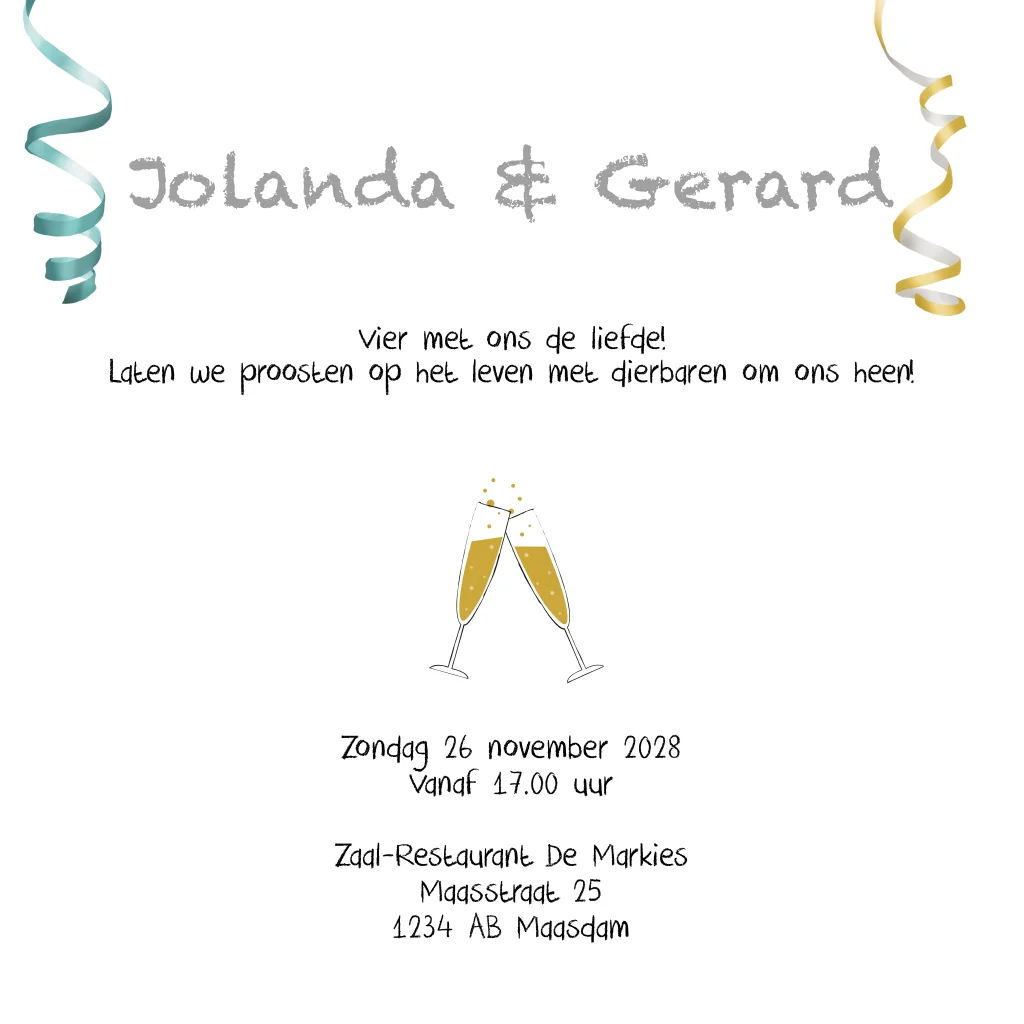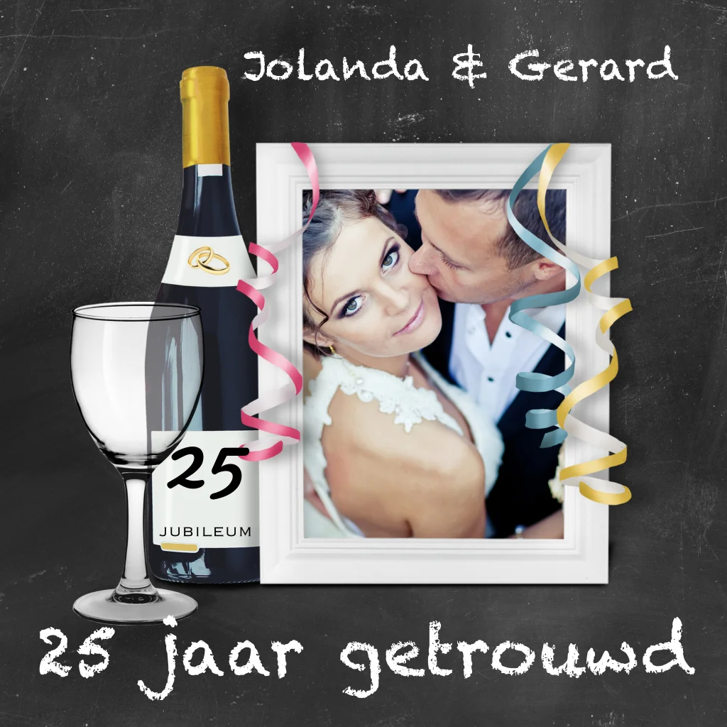 Feestelijk 25 jarig jubileumkaart op krijtbord met sierlijke vrolijke slingers. En persoonlijk door de foto van jullie samen. Gaaf met een opvallende kleur envelop!