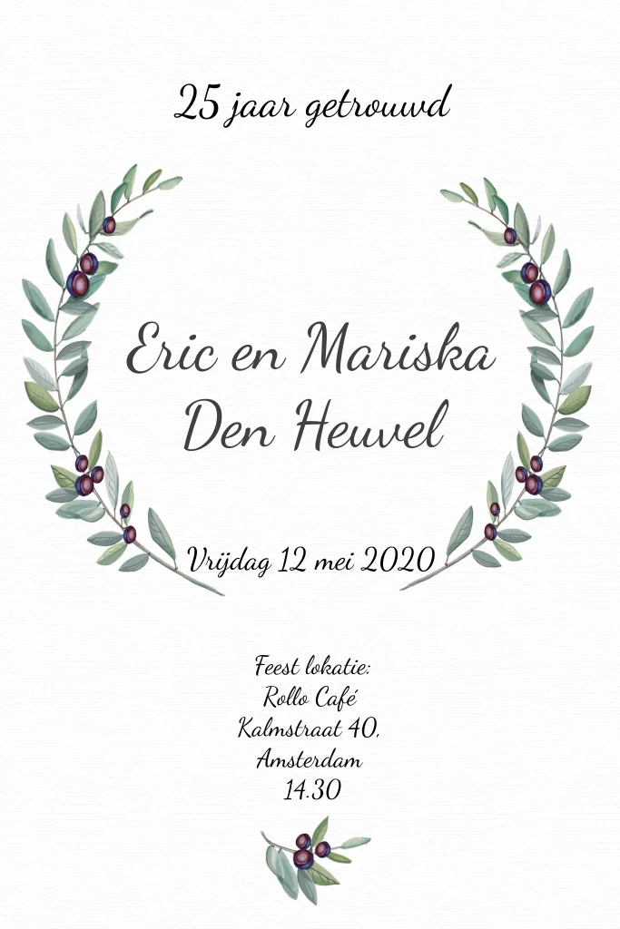 Prachtige tijdloze kaart voor 25 jarig jubileum met olijftakken in groen.