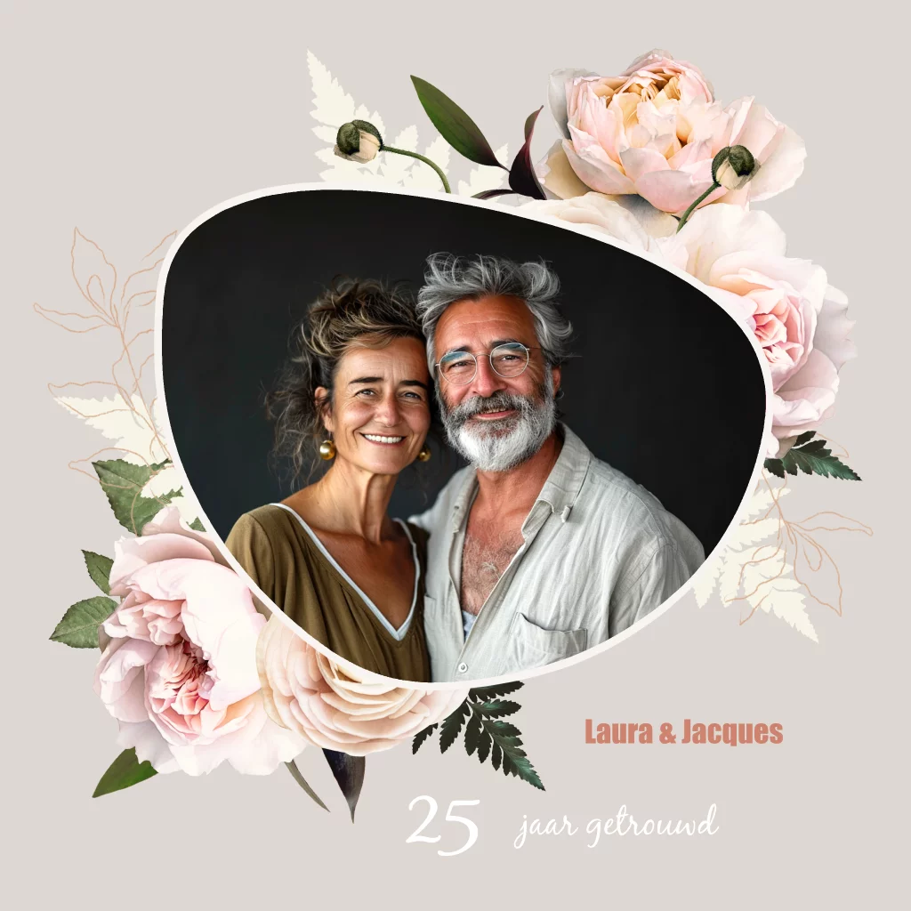 Superleuke uitnodiging voor jullie trouw jubileum. Met roze rozen en een hip kader voor jullie foto. Teksten zijn makkelijk aan te passen.