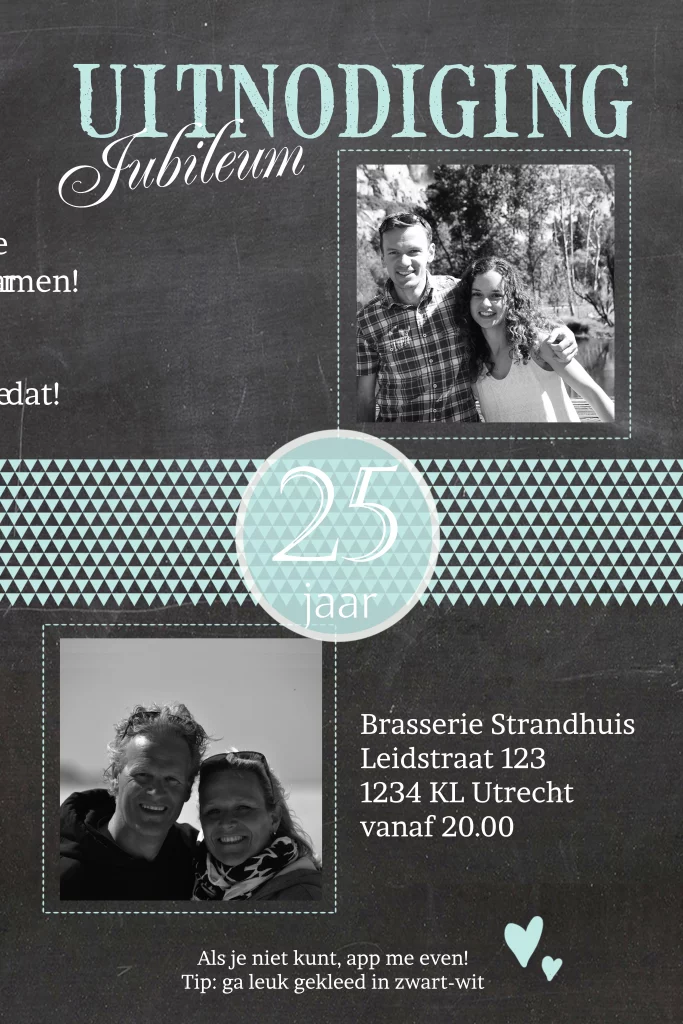 Stoere jubileumkaart met eigen foto's en verschillende lettertypes.