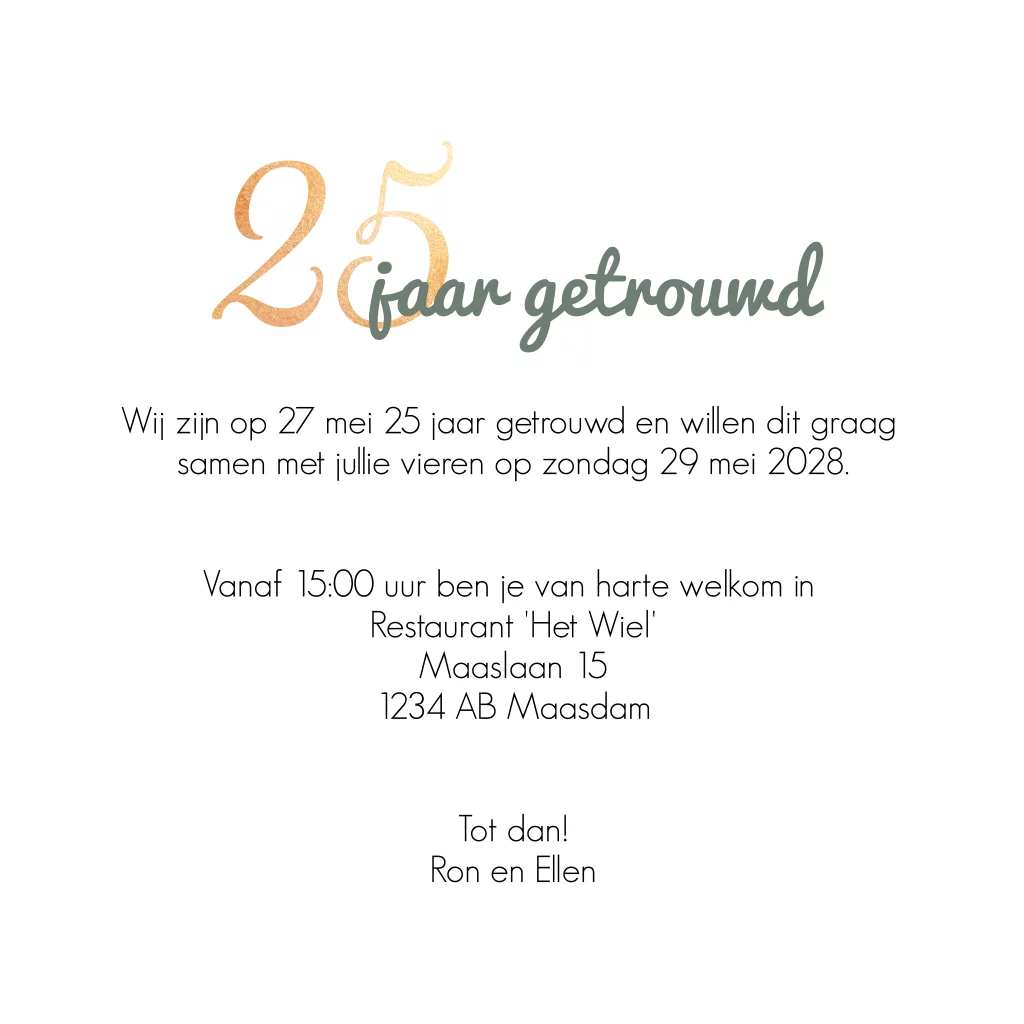 Feestelijke uitnodiging voor een vijfentwintig jarig huwelijksjubileum die lekker in de tuin gevierd gaat worden. Steek de BBQ maar aan en nodig al jullie vrienden en familie uit met deze feestelijke uitnodiging. Gaaf met een gouden envelop en bijpassende sluitzegel!