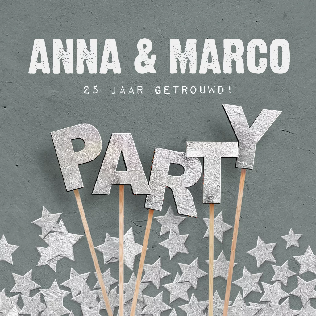 PARTY! Deze vrolijke en feestelijke uitnodiging is leuk om naar al jullie vrienden en familie te sturen. De zilveren letters en sterren passen helemaal bij jullie zilveren huwelijk. En maak het dan ook af met een zilveren envelop!