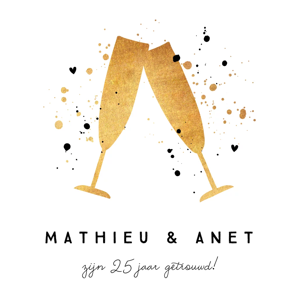 Vrolijke uitnodiging voor een 25 jarig huwelijksjubileum. Met goudkleurige champagneglazen en spetters en lieve kleine hartjes. Pas de tekst gemakkelijk zelf aan. Leuk met een gouden envelop.