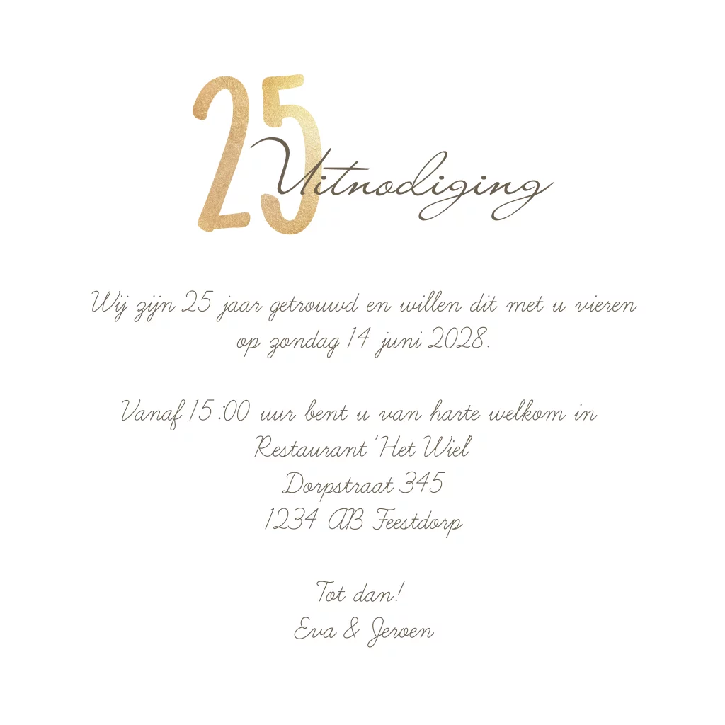 Mooie sprankelende uitnodiging voor een 25 jarig huwelijksjubileum. Mooi opgemaakt met gouden sterren en ruimte voor een persoonlijke foto van jullie samen. Maak het compleet door er een gouden envelop bij te kiezen.