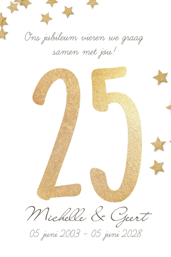 Feestelijke uitnodiging voor een 25 jarig huwelijksjubileum. Mooi opgemaakt met gouden sterren en een grote gouden 25 op de voorkant van de kaart. Maak het compleet door er een gouden envelop bij te kiezen.