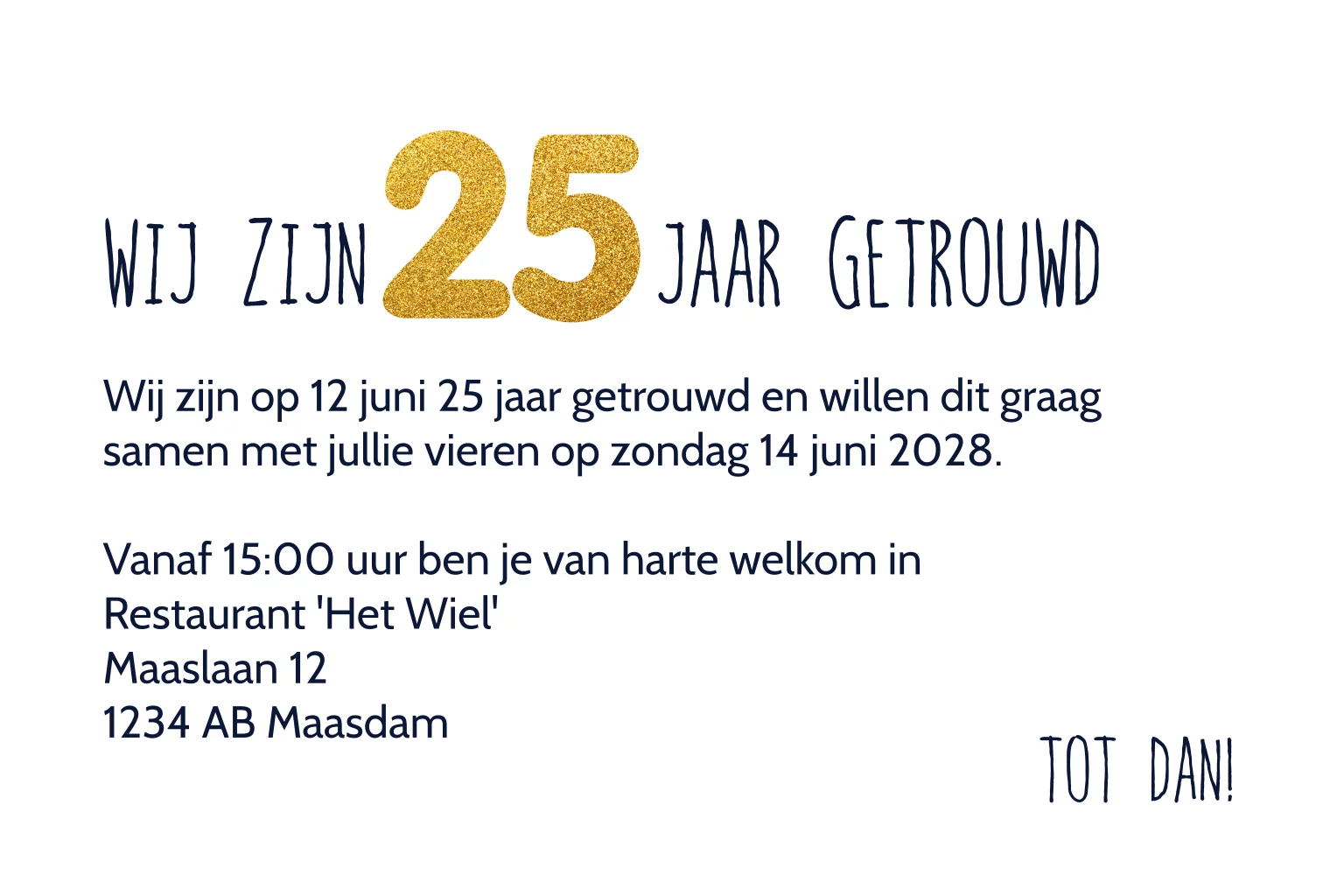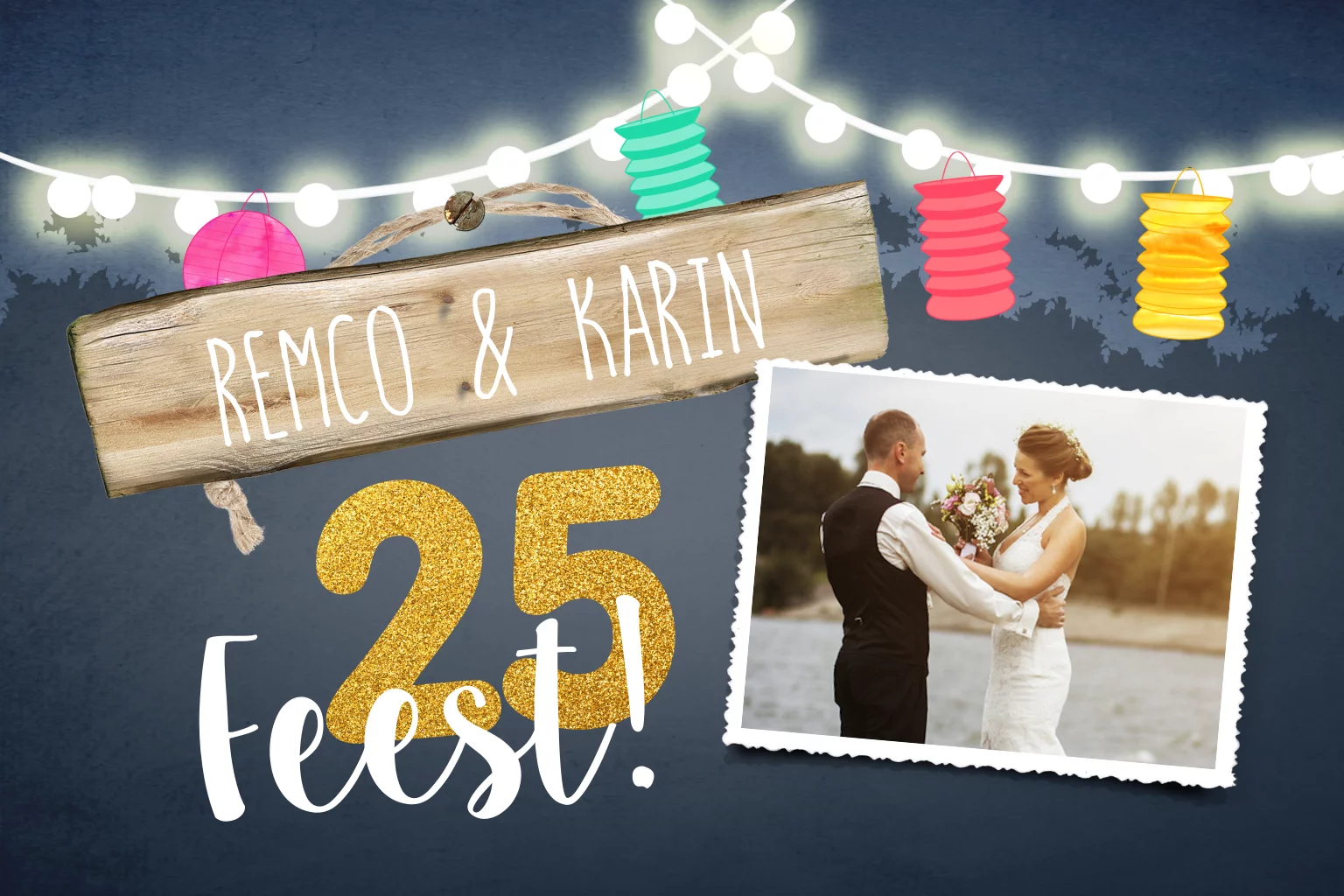 FEEST! Vier je 25 jarig huwelijksjubileum eens met een gezellig tuinfeest! Deze feestelijke kaart past daar perfect bij. Een persoonlijke foto, lampionnen en lichtjes op je kaart, wat wil je nog meer? Kies voor een vrolijke kleur envelop.