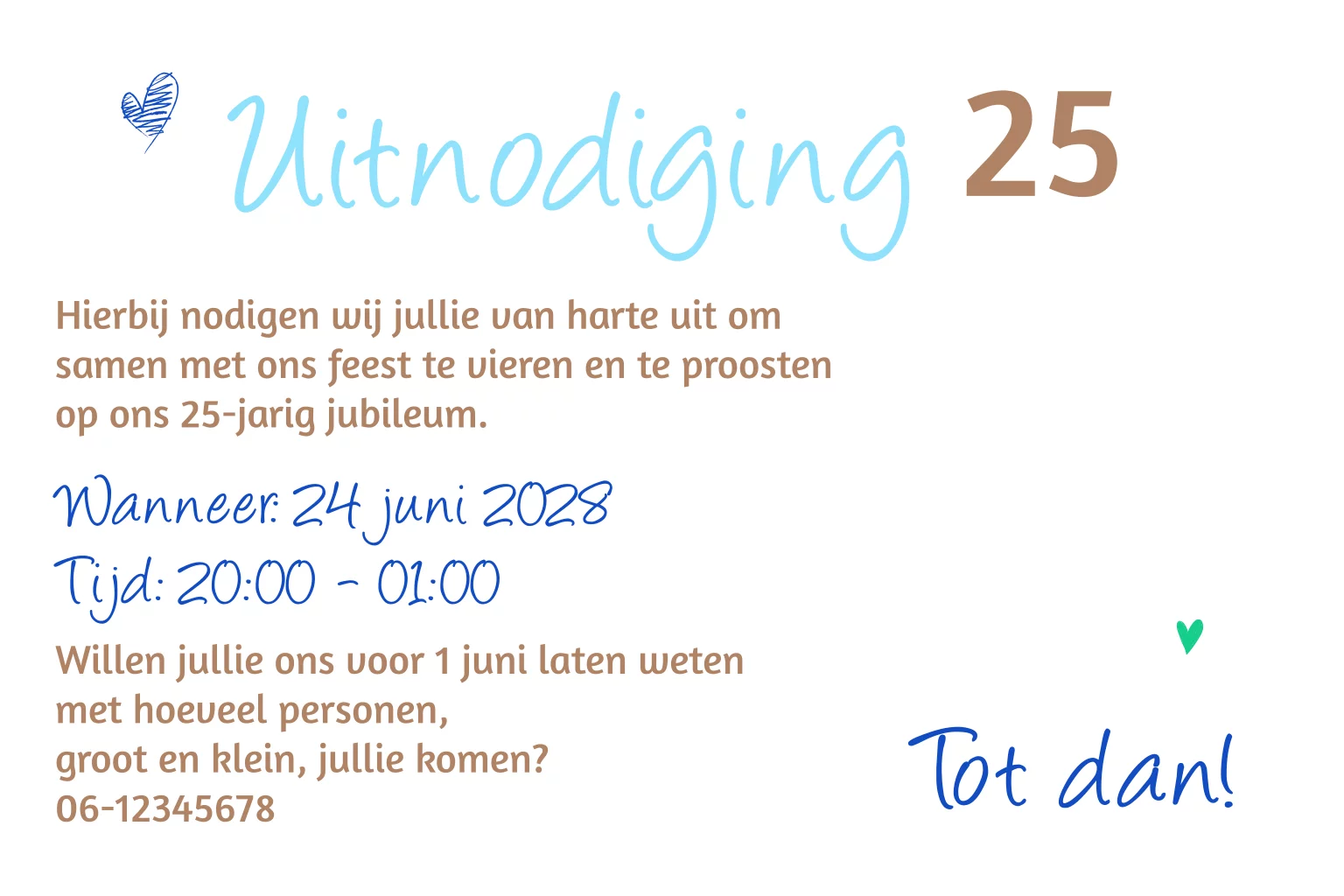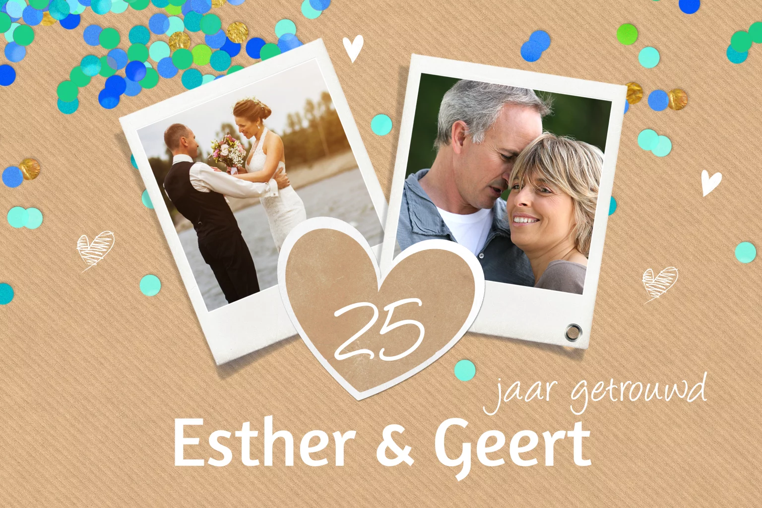 Feestelijke uitnodiging voor jullie 25 jaar getrouwd feest. Verschillende lettertypes op kraft achtergrond met toevoeging van persoonlijke foto's en confetti. Maak het compleet met een bijpassende kleur envelop.