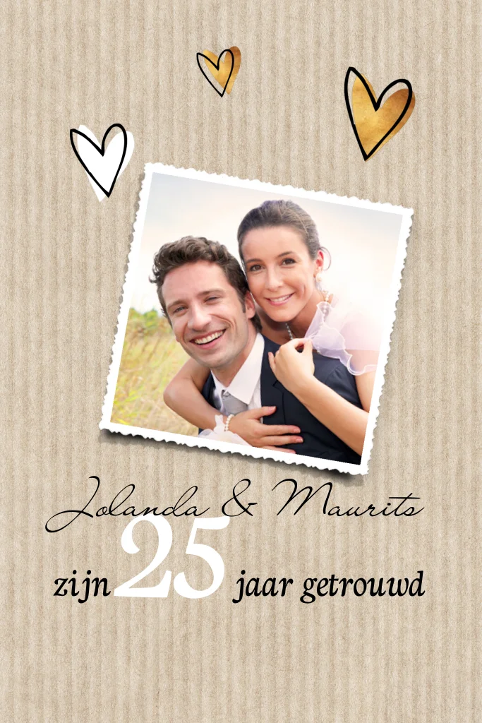 Lieve uitnodiging voor jullie 25 jaar getrouwd feest. Verschillende lettertypes op kraft achtergrond met toevoeging van gouden hartjes. En persoonlijk door de foto van jullie samen aan de binnenkant van de kaart. Maak het compleet met een gouden envelop.