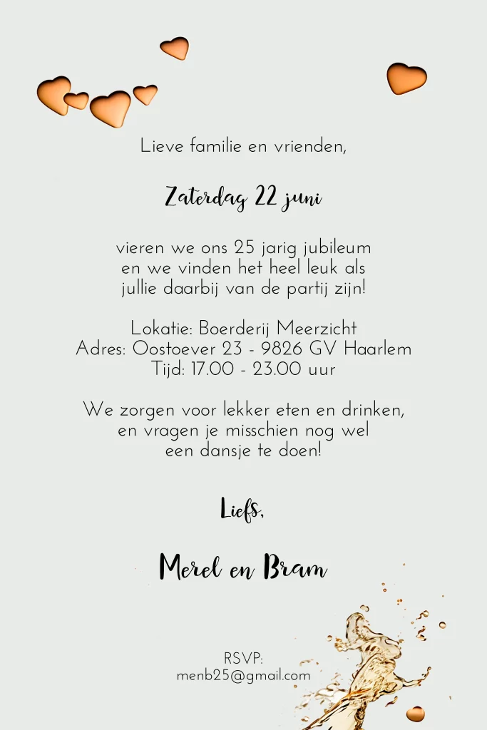 Een prachtige uitnodiging met hartjes en je naam in metal goudkleur is mooi. De klinkende champagne laat de hartjes er vanaf spatten.