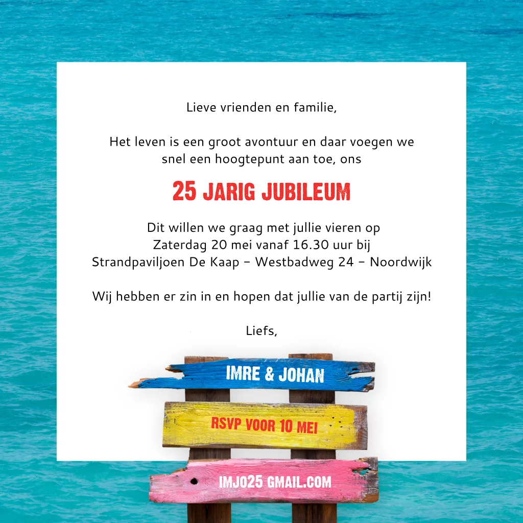 Vrolijk gekleurde wegwijzer als uitnodiging voor je huwelijksjubileum. Met een prachtig azuurblauwe zee als achtergrond.
