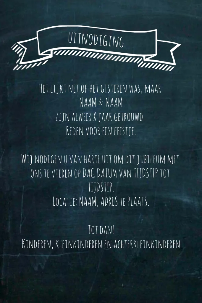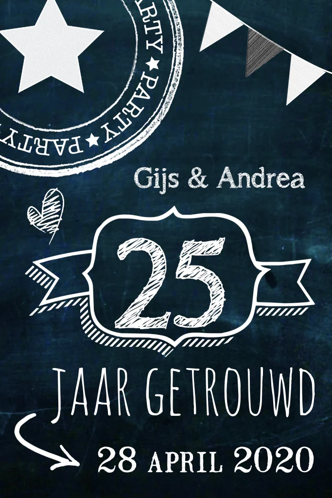 Hip kaartje in krijtbordlook. Leuk door de verschillende elementen als vlaggetjes, hartje en banner waar het jaartal van jullie jubileum in kan staan.