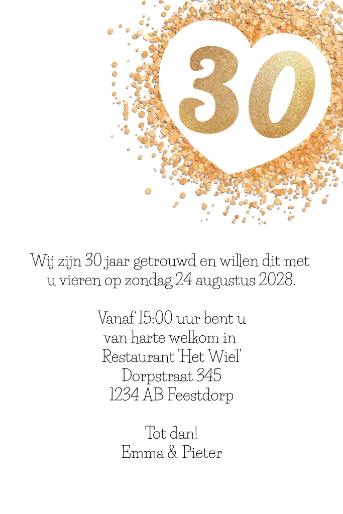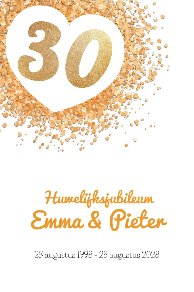 Feestelijke uitnodiging voor een 30 jarig huwelijksjubileum. Groot hart met oranje confetti en gouden dertig in het midden van de kaart. Maak het af met een gouden of oranje envelop.