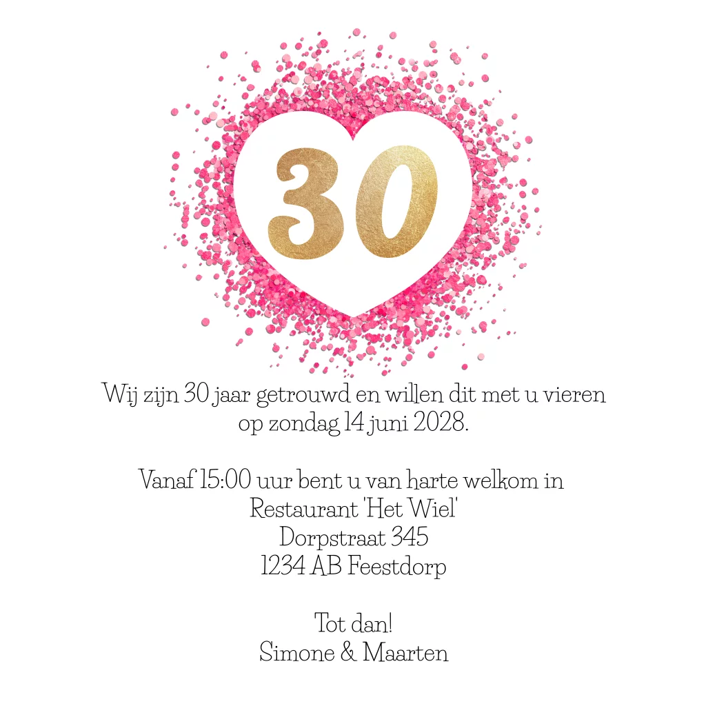 Uitnodiging 30 jaar getrouwd met roze hart en gouden 30