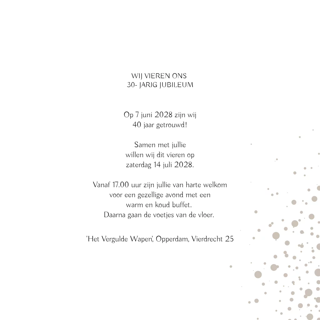 Feestelijke 30 jarig jubileumkaart. Met folie. Plaats je eigen foto's en maak het geheel af met een mooie sluitzegel en een roestbruine met gouden inlay envelop.