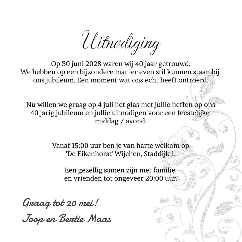 Sierlijke uitnodiging voor jullie 40 jarig jubileum. De kaart is feestelijk door de toevoeging van zilveren glitter lijnen. Op de voorkant is er ruimte voor een persoonlijke foto van jullie samen. Maak het af met een zilveren envelop!