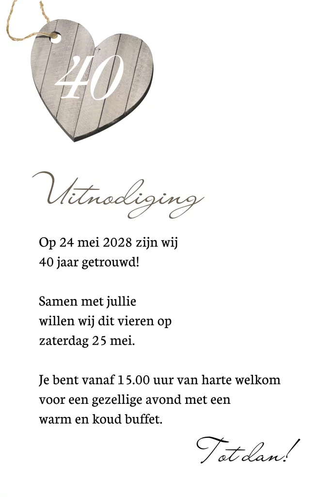 Uitnodiging 40 jaar getrouwd met houten hartje