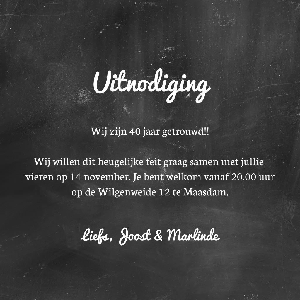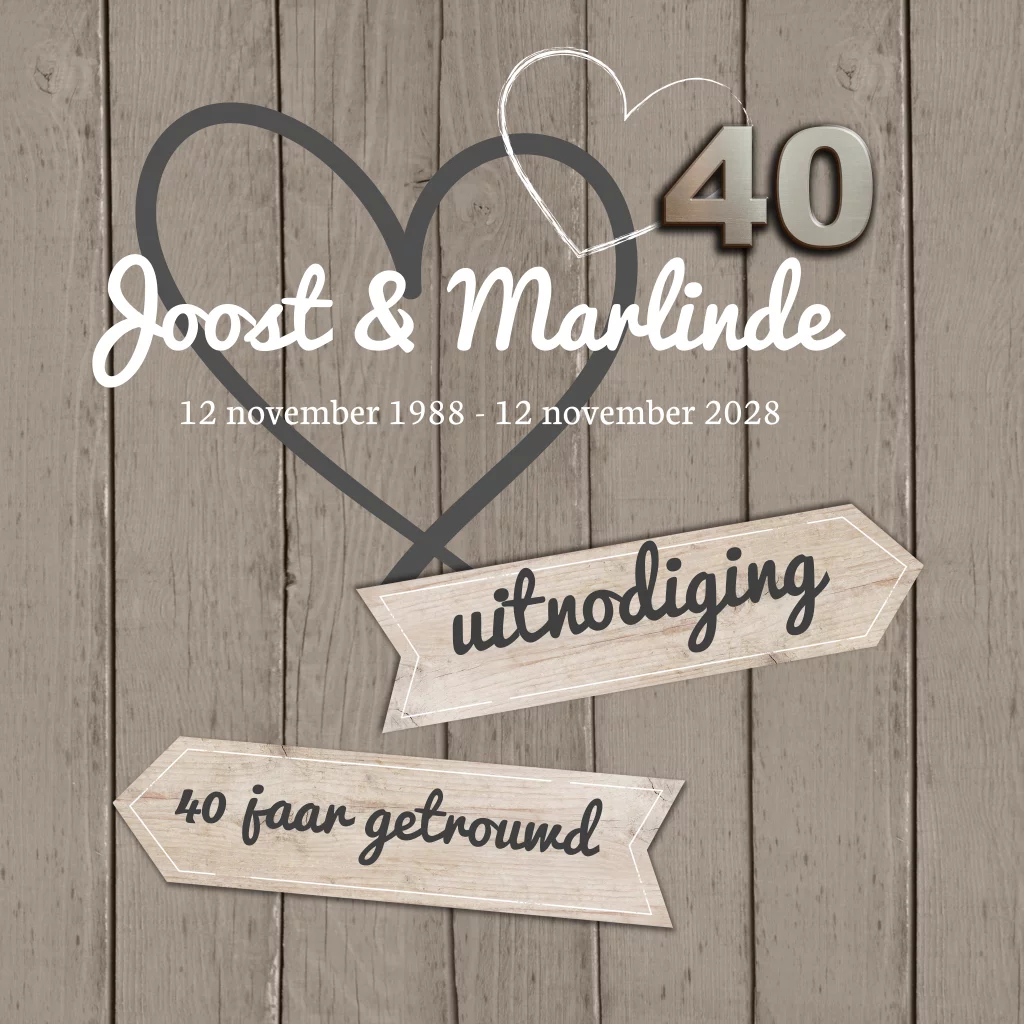 Romantische uitnodiging voor jullie 40 jarig jubileum. Door de hout achtergrond springt het hartje met jullie namen echt uit de kaart. Leuk ook met de toevoeging van wegwijzer bordjes.
