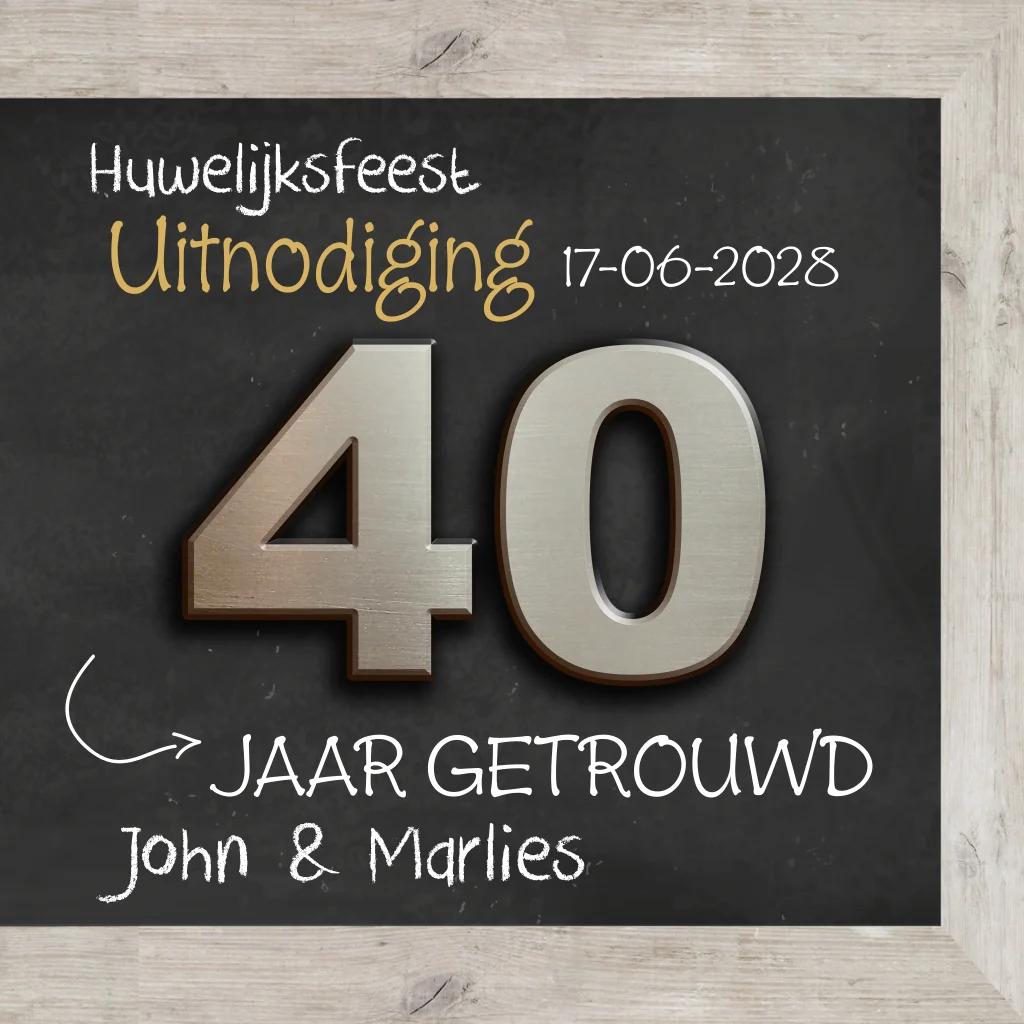 Uitnodiging voor een 40 jarig huwelijksjubileum. Deze kaart heeft een krijtbord print met een grote zilveren 40 in het midden. Mooi afgewerkt met hout rand. Maak het af met een zilveren envelop.