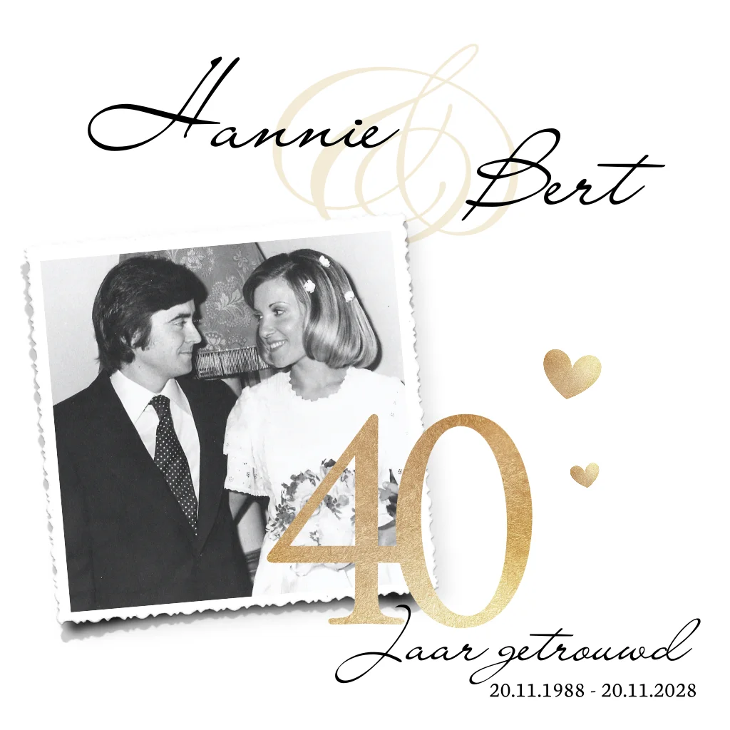 Sierlijke 40 jaar getrouwd uitnodiging! De veertig wordt ondersteund door een mooie persoonlijke foto. Liefdevol met 2 hartjes ernaast. Parelmoer als papiersoort is een aanrader!