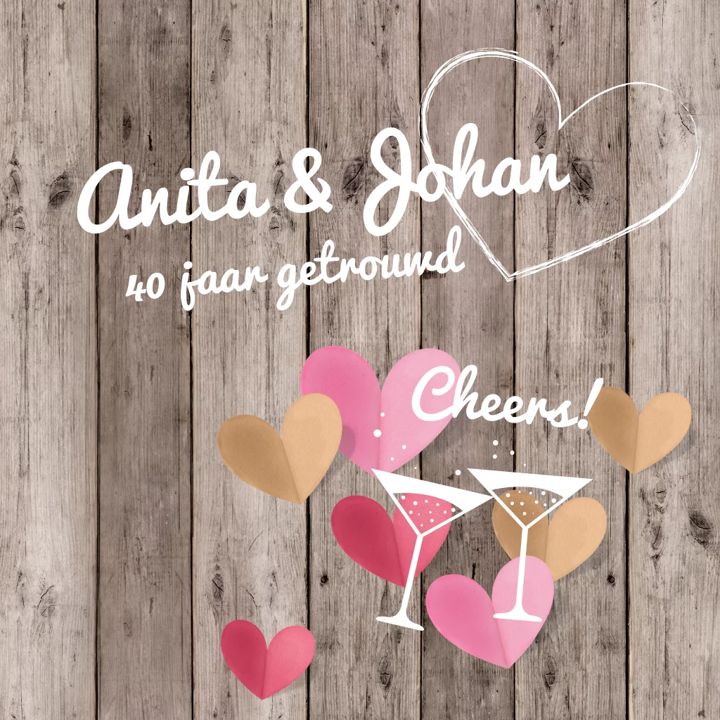Gefeliciteerd, een robijnen huwelijk! Verstuur deze 40 jaar getrouwd uitnodiging met vrolijke hartjes op een achtergrond van hout. Maak het helemaal af door te kiezen voor een roze envelop!