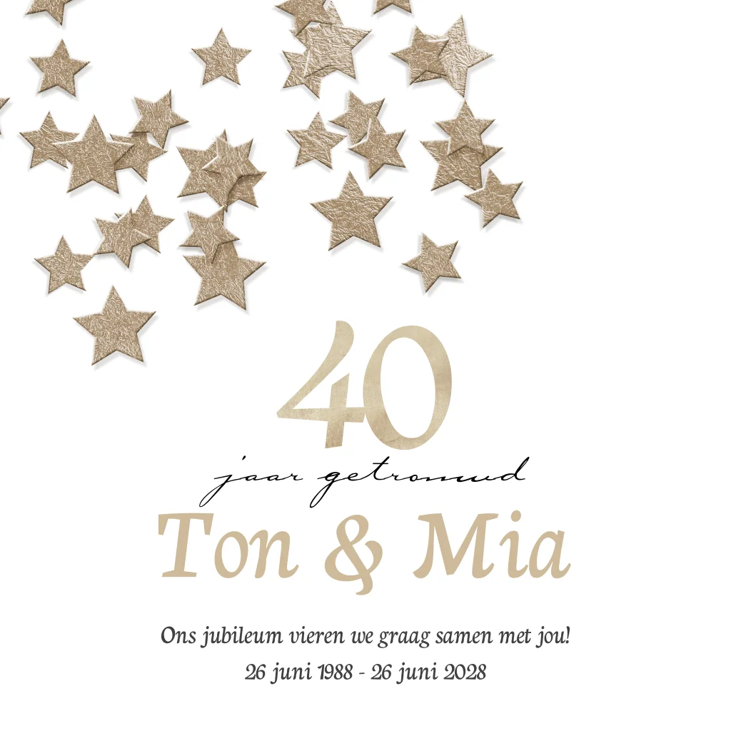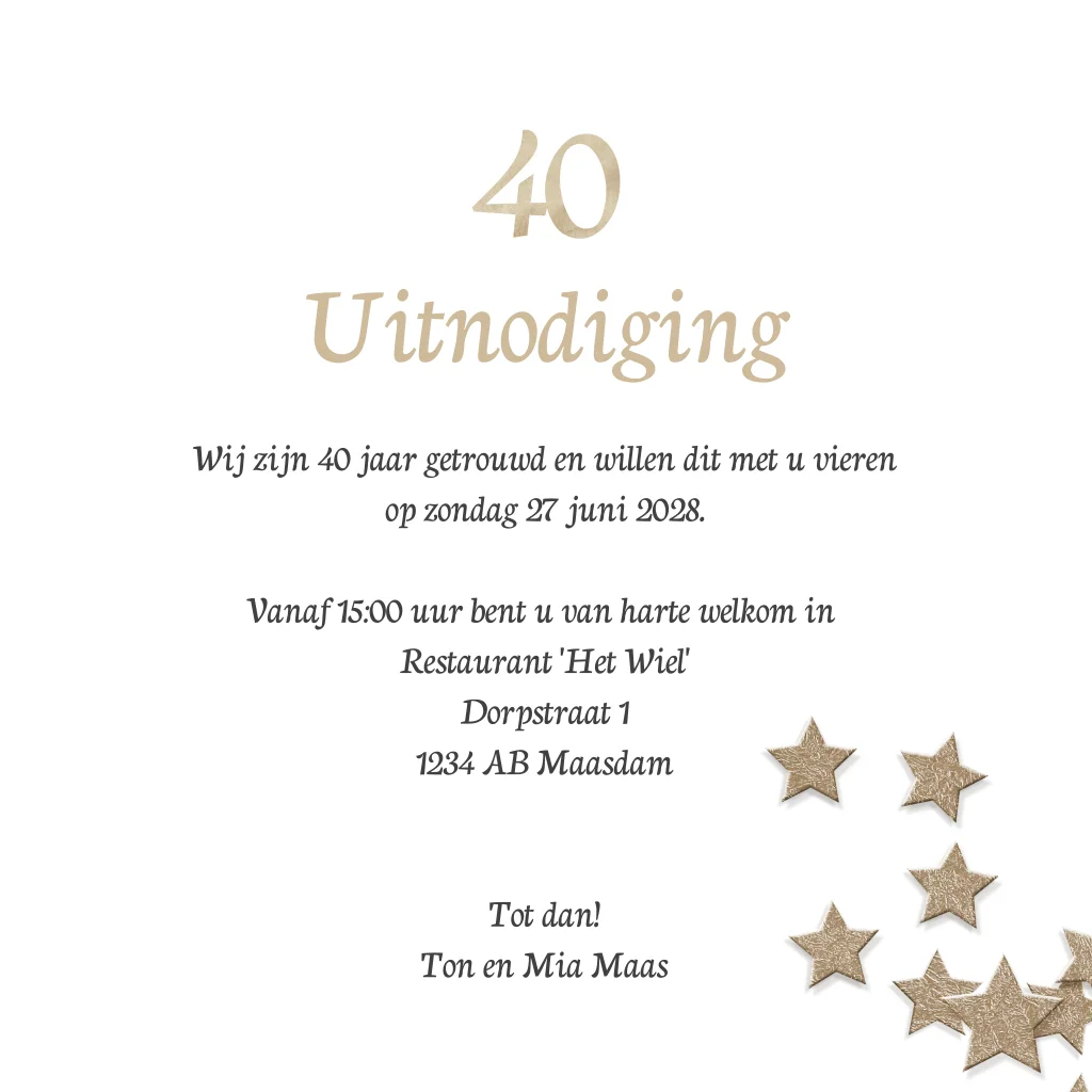 Vrolijke en feestelijke 40 jaar getrouwd uitnodiging! De veertig wordt ondersteund door veel sterren confetti. Gaaf in champagne zilver kleurige tinten. Parelmoer als papiersoort is een aanrader!