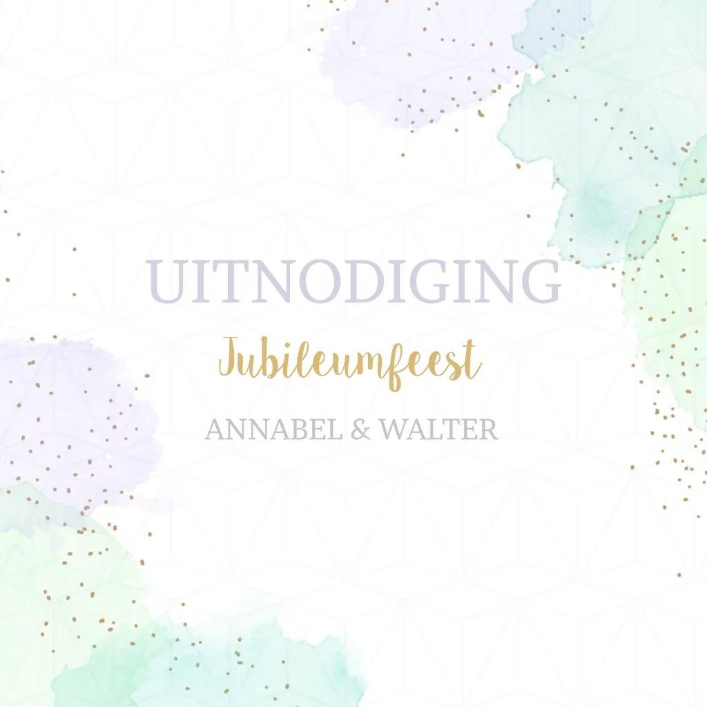 Bijzonder leuke en originele vierkanten jubileumkaart voor 40 jarig huwelijk. Mooie pastel kleuren met waterverf look en gouden stipjes. Maak het af met een bijpassende kleur envelop en sluitzegel!
