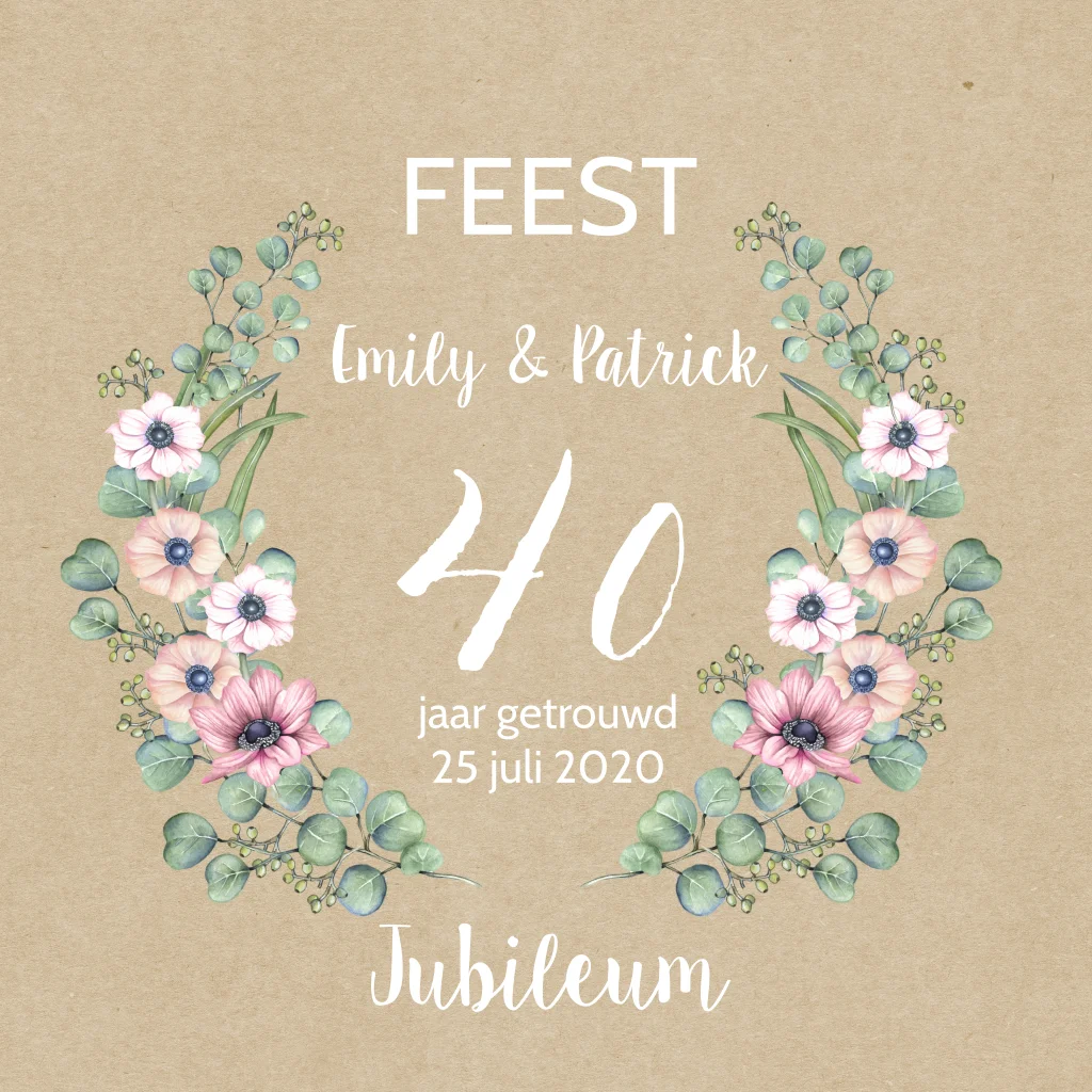 Uitnodiging voor een veertig jarig huwelijksjubileum met mooie anemonen en eucalyptusblad op een kraft achtergrond. Mooi om te combineren met een kraft envelop.