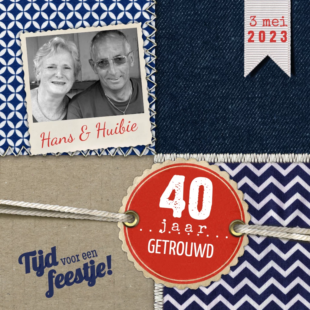 Leuke, vierkante kaart als uitnodiging voor een huwelijksjubileum. Met spijkerstof, karton en leuke patronen. Voeg uw eigen foto toe voor een persoonlijke kaart.