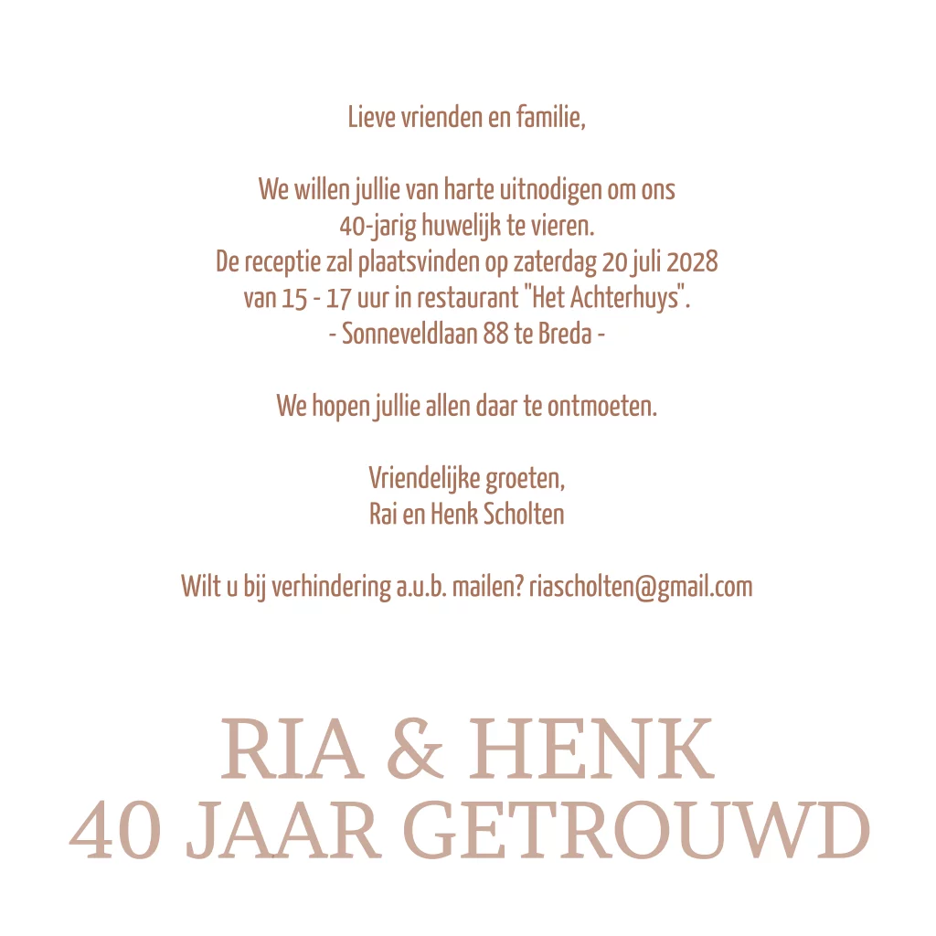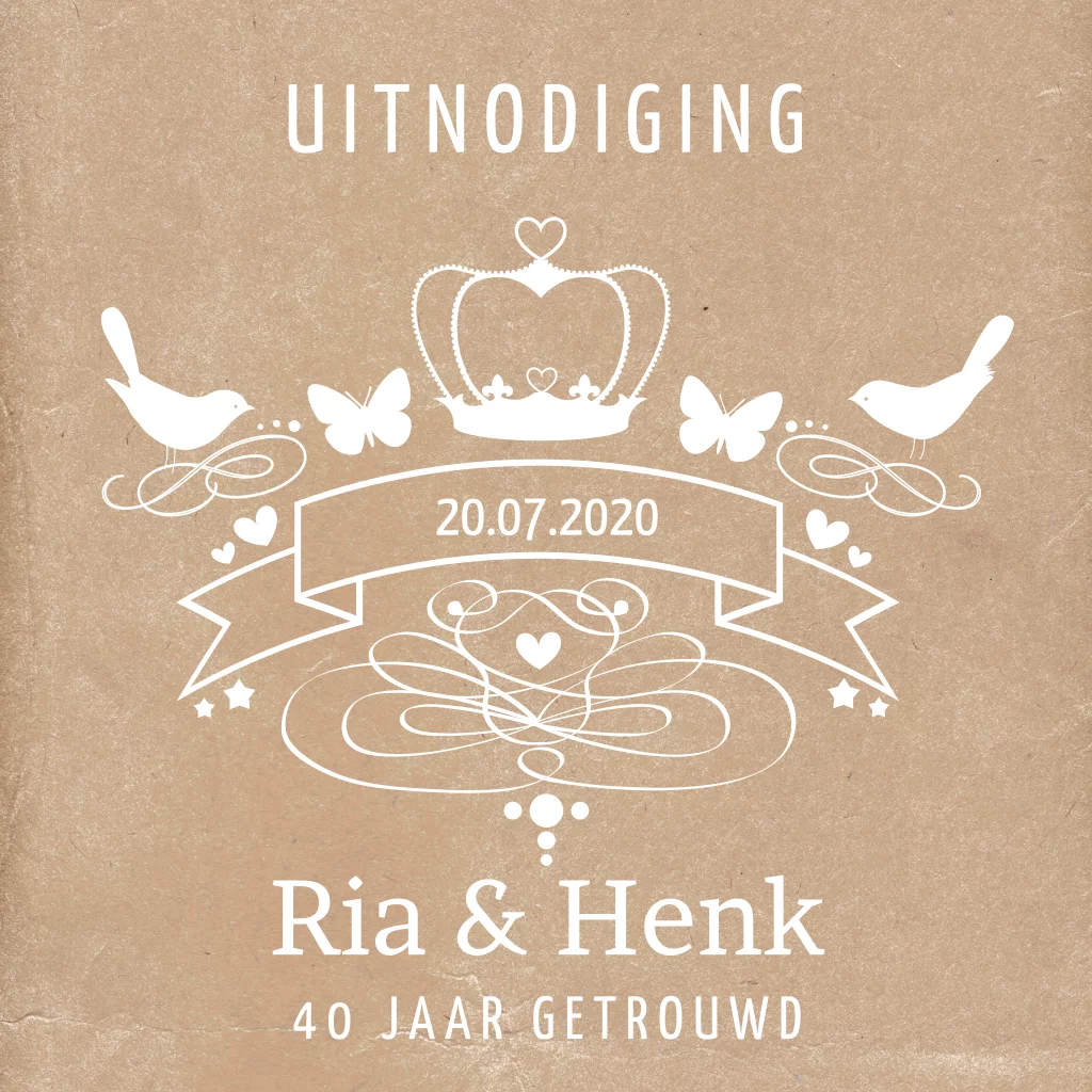 40 jaar getrouwd? Deze kaart met kraft achtergrond is te vullen met eigen tekst én foto (binnenkant kaart) en kan naar al jullie gasten verstuurd worden. Mooi versierd met witte illustraties van vogels, vlinders, hartjes en sierlijke lijnen.