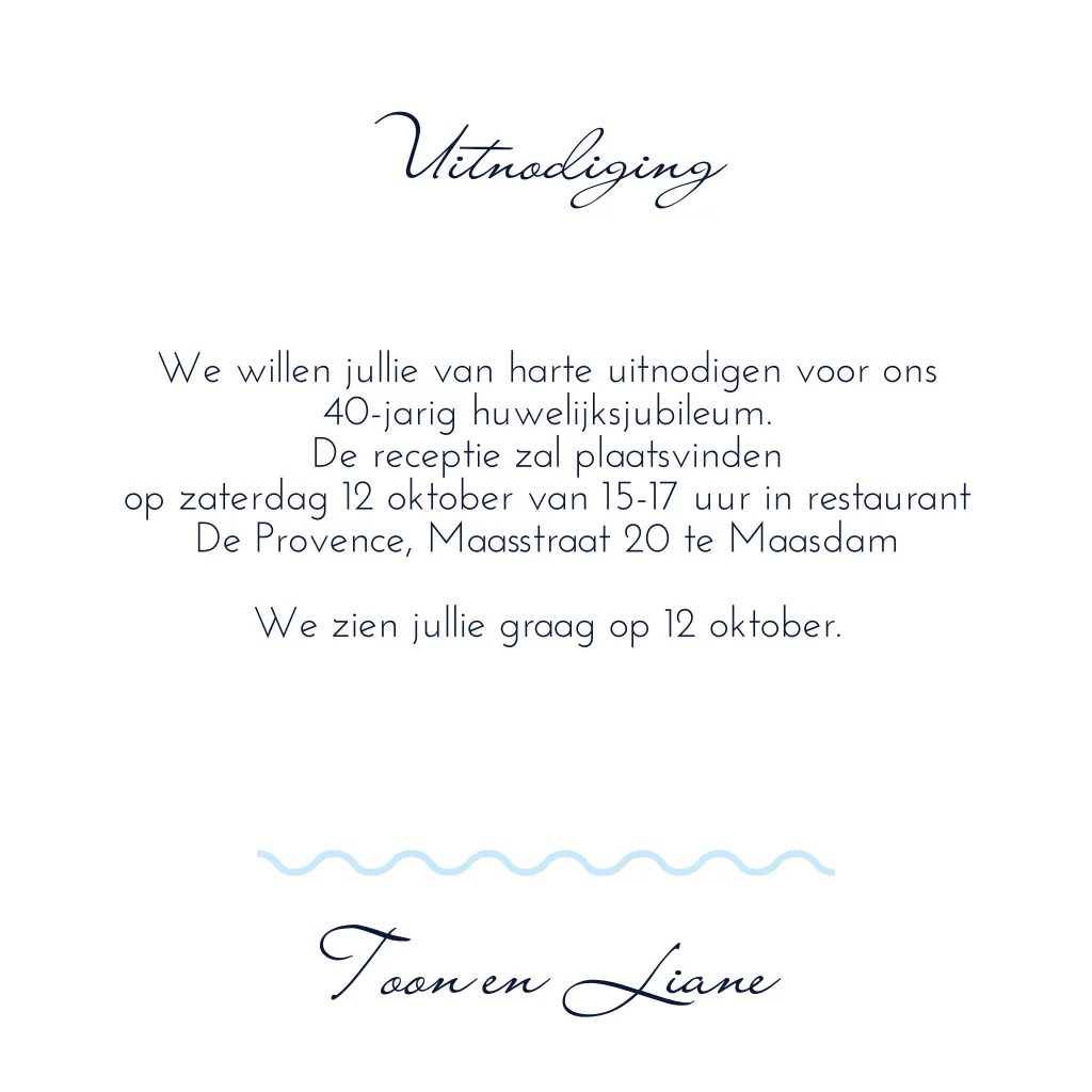 Jullie 40-jarige jubileum voor de boeg? Deze liefdevolle kaart met zeesterren en strand thema is persoonlijk te maken met eigen tekst. Aan de binnenkant ruimte voor een foto van jullie samen.