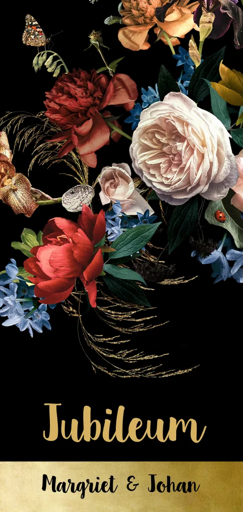 Prachtige uitnodiging jubileum met bloemen in de stijl van de oude hollandse meesters. Klassiek en hip tegelijkertijd. Past heel mooi bij een 40 jarig huwelijksjubileum. Tip! Pas de kleur van de envelop aan op een kleur uit de kaart.