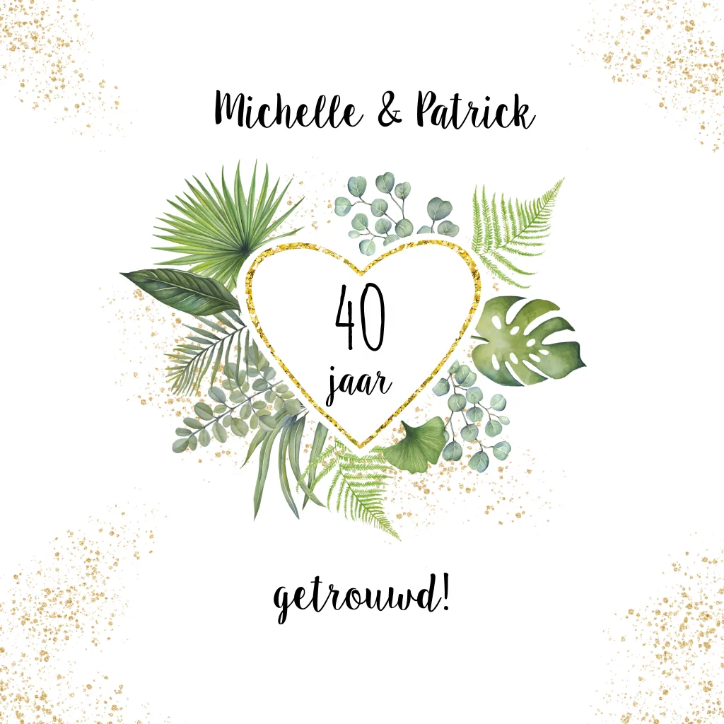 Uitnodiging voor huwelijksjubileum veertig jaar getrouwd met hartje en versierd met bladeren. Botanisch zoals eucalypthus takjes en tropische bladeren. Leuke goudkleurige elementjes maken deze kaart helemaal af. Kies voor een gouden envelop!