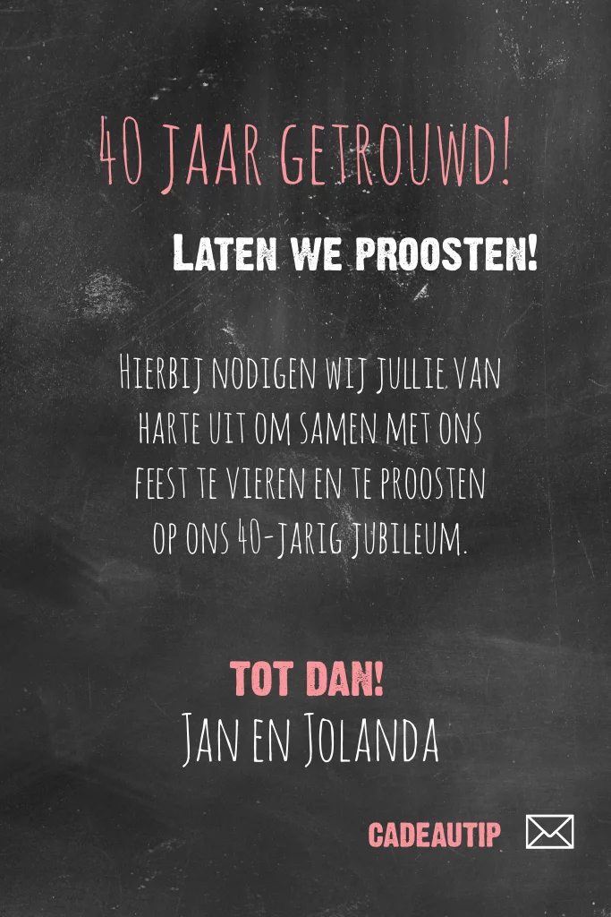 Uitnodiging 40 jaar getrouwd met roze accenten, persoonlijke foto en vrolijke lettertypes op een krijtbord achtergrond. De kaart past leuk bij een roze envelop en bijpassende sluitzegel.