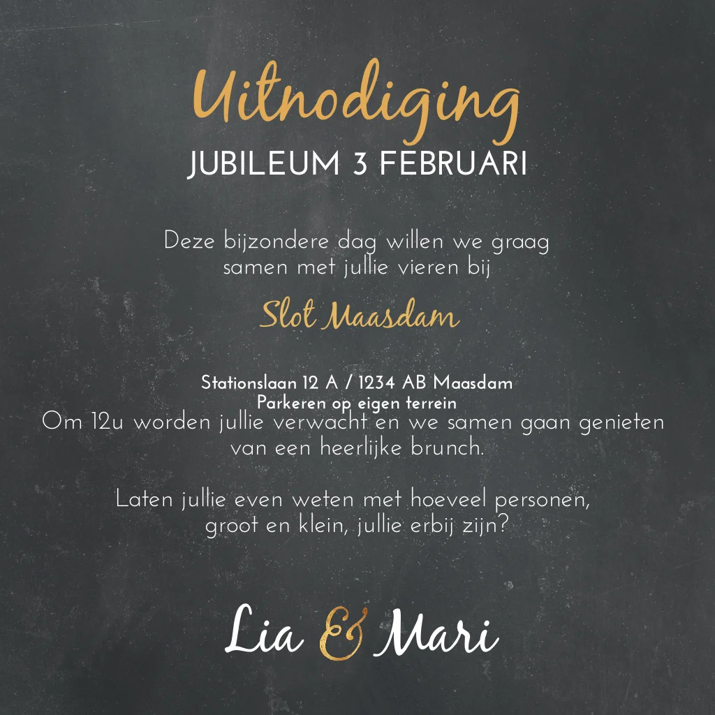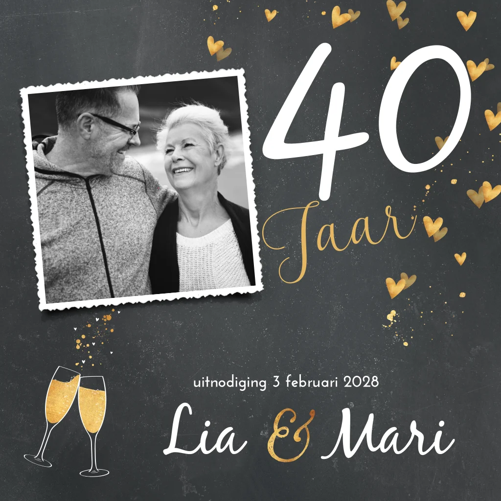 Uitnodiging 40 jaar getrouwd met krijtbord achtergrond en lieve goudkleurige hartjes. Aan de binnenkant is er ruimte voor een persoonlijke tekst en op de voorzijde voor een foto van jullie samen. Via de 'vervang' button voeg je gemakkelijk je eigen foto toe. Mooi met een gouden envelop.