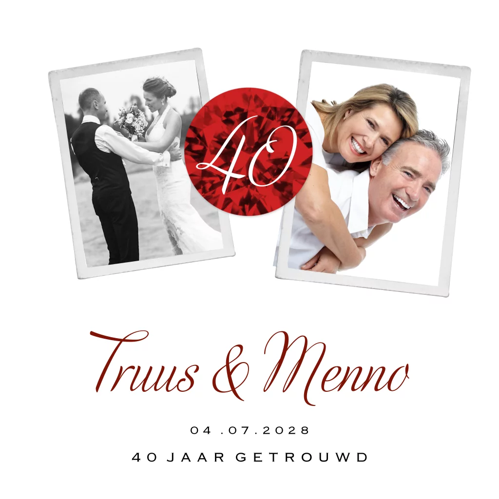 Mooie strakke maar feestelijke uitnodiging voor jullie 40 jarig huwelijksjubileum. Gaaf door een foto van toen en nu toe te voegen. Mooi geïllustreerd met een robijntje, want dat hoort uiteraard bij een robijnen huwelijk! Maak het af met een rode envelop.